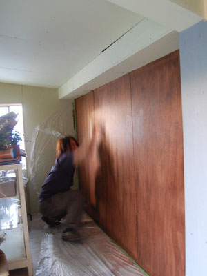 とらねこ本舗 セルフリノベーション工事。 大工工事 ほぼ完了し、いよいよ仕上げ工事へ! まずは壁ラワン合板をオスモ塗装。色はウオールナット。施主さんから今日は、外壁のペンキでもしようかな、と余裕をかましてましたが、ひょっとFBを見るとラワンを塗ってるではないか! 嫌な予感がして、現場へ。予想通り、オスモでコッテコテに…。ホームセンターに走りうすめ液と、ウェース調達。もう夕暮れ前、照明器具がない現場。追い込む。上からオッテコテの塗料を引き延ばすように。新しい塗り方! しかし、施主さんが一部壁を塗りました~、みたいなお子さんと一緒に写っている写真に憧れていましたが。えらいワイルドなセルフ写真となりました…。