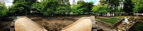 栂・美木多駅から、桃山台の方に緑地を歩いて行ったところに、コロシアムがありました。こじんまりとしていて、こんなところで野外音楽会や格闘技大会なんかやれば、おもしろいと思うんですが。こんな場所、好きですね。