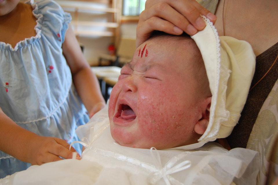 鎌倉時代ころから始まって一般化した、赤ん坊と氏神様(自分が居住する地域の守り神、産土神(うぶすながみ))との対面の儀式です。赤ちゃんが初めて公的に外出する機会であり、氏神様の神社を参拝します。宮参りの子供の額に『犬』の字や、男児なら『大』、女児なら『小』の字を書くという例は全国で聞かれる。これは本来は『アヤツコ』とよばれ、もとは二つの線が斜めに交わる形状を指し、かまどの墨や、鍋墨で『×』のしるしをつけるものであった。それがいつしか『犬』や『大』の文字に変わり、また鍋墨では汚いので紅が用いられるようになった。ゆえに『大』や『小』の文字には特別な意味はないのである。アヤツコは異なった世界が交差することを意味する印で、それが転じて魔よけと見なされるようになったものと考えられる」要するに魔よけのおまじない「×」の印が変化して「犬」や「大」になり、「大」の対となる「小」が生まれたということでしょうか。古くは古事記にも額に犬と書いたとあるそうですので、このおまじないは千数百年の歴史をもつ風習のようです。関西(主に京都地方)の魔よけの風習のようですね。「大」は元気に、「小」は健康に育つようにとのことです。
