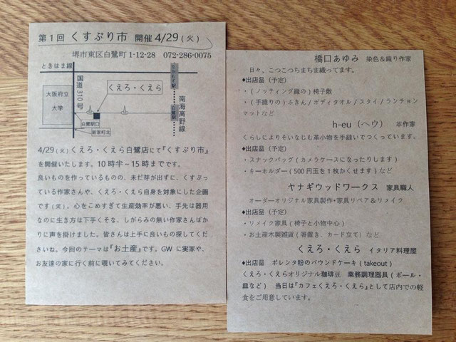 「今度くすぶり市というクラフト市を開催するので、見学会チラシおきましょうか。」というありがたいご連絡をいただき、見に行って来ました。