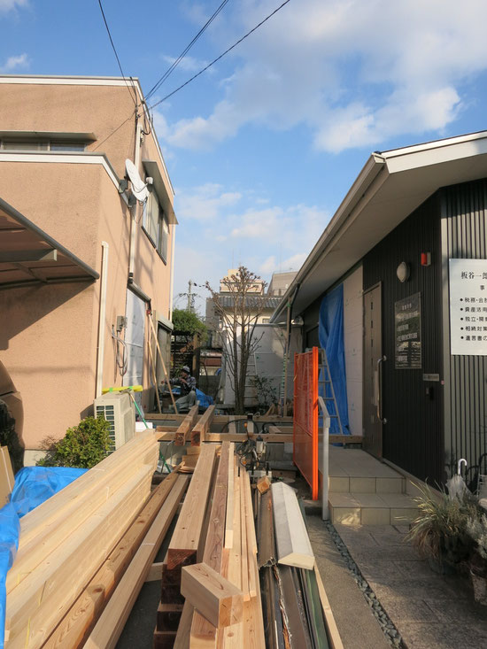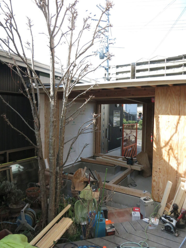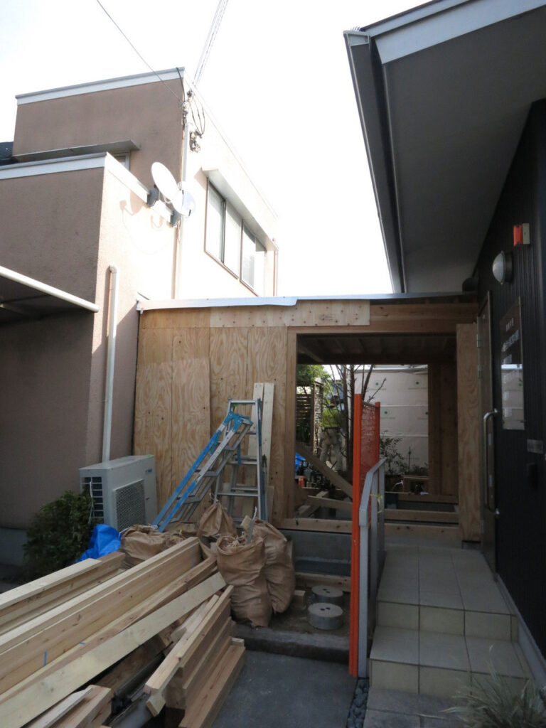 基礎工事と同様、既存住宅と事務所の間に新しく繋ぐように建てるので、設備関係の取り合い、屋根の納まりや樋関係等、絡む工事が多く、難易度の高い作業となりました。
