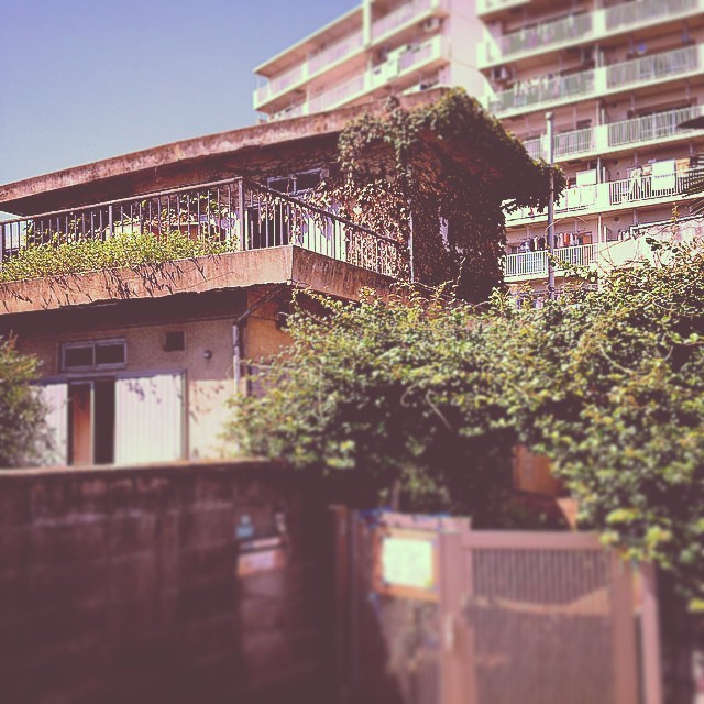 RC2階住宅。植栽の感じ、RCの素材感、2階バルコニーの広がり。周りの高層マンションの中にぽつんと建った1戸建て。ここだけ昔のまんまの空気感が残ります。建て替えにはなりますが、木造の小さな家ができます。こんな雰囲気を、少しでも継承したいと思います。