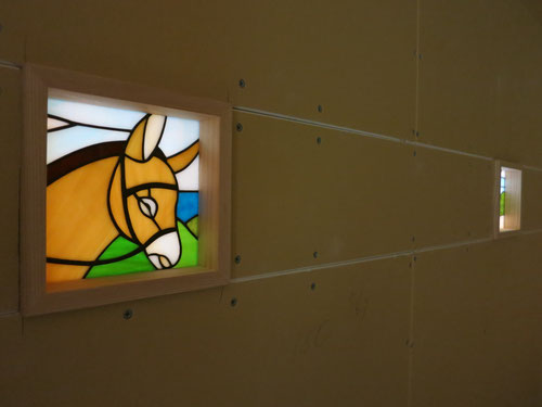 上棟後の造作工事も順調に進み、大工さんの工事が完了しました。トレードマークのぷらてーろ、ろばのステンドグラスも、きれいに入っています。