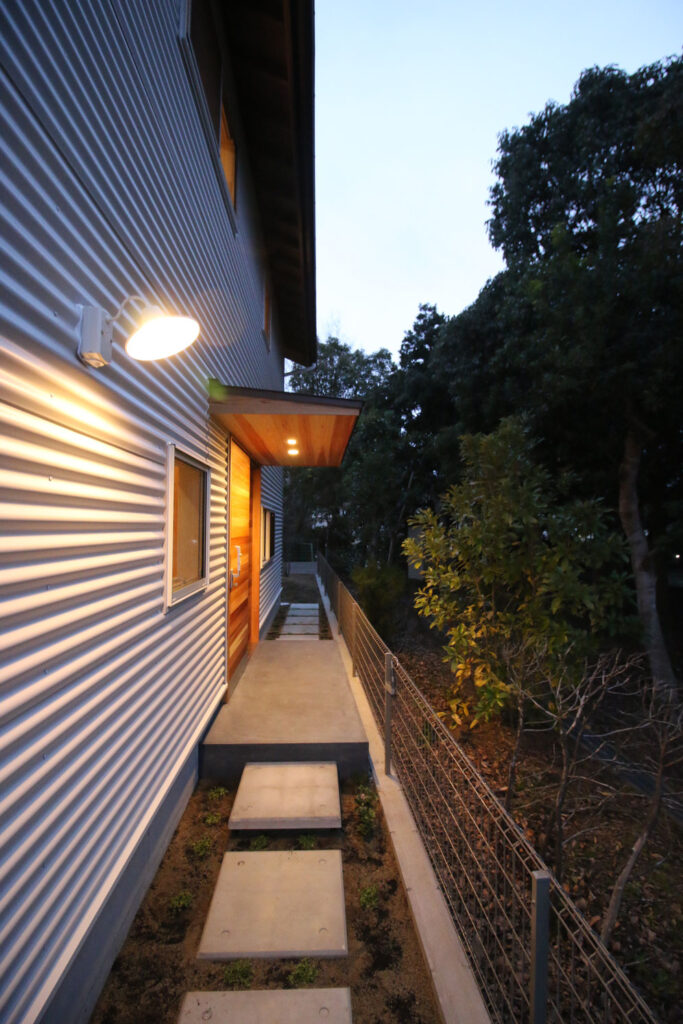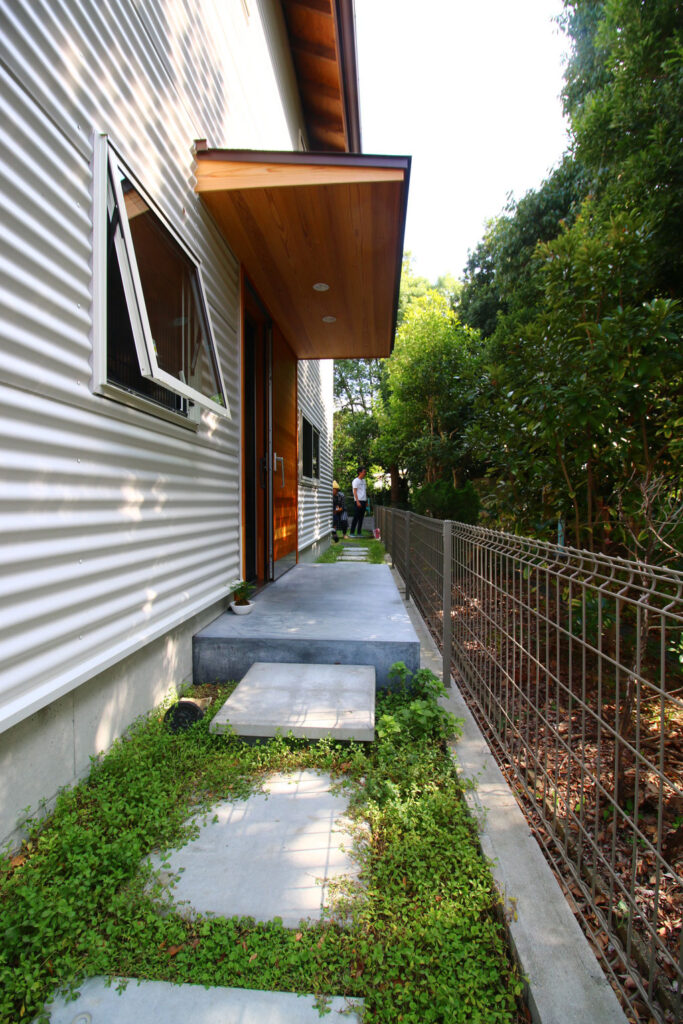 前面道路からは、このような形になり、住宅の間口と、側面から入るアプローチの幅と、ぎりぎりまで検討しました。