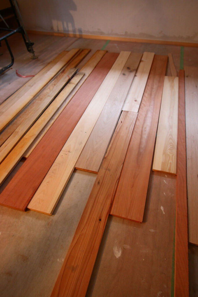 このイメージでいこうと、清水工務店さんと打ち合わせして、清水さんとこの工場にある材や、私の家に眠っている材を持ち寄って、現場に並べてみる。