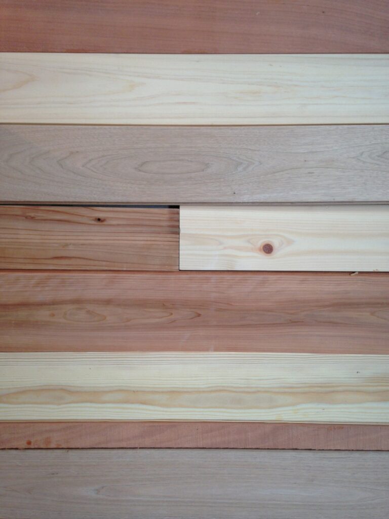 本箱の背板、いろんな木を持ってきてばらばらに貼ったら、結構おもしろい感じになった。