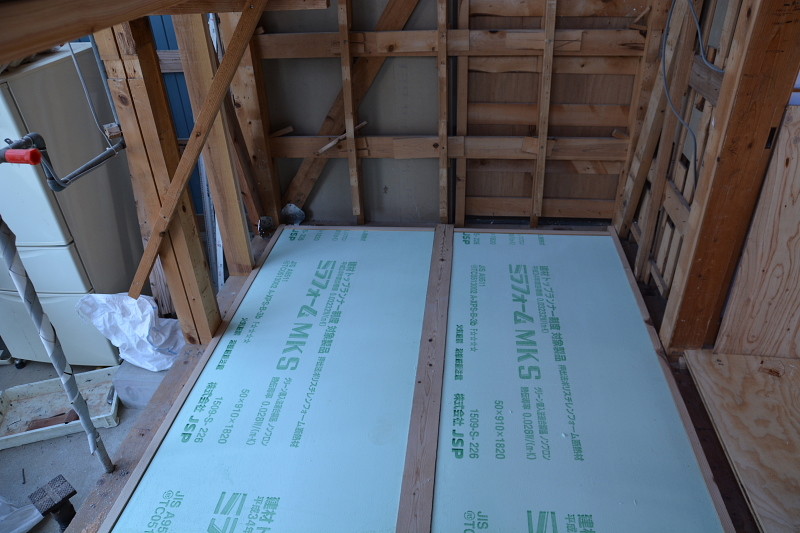 また、床には断熱材。今回の大きなテーマの耐震と断熱リフォーム。
