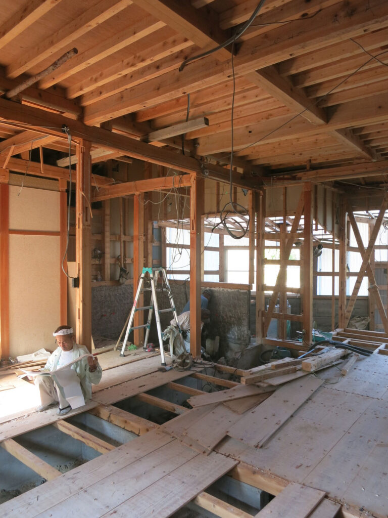 解体してみると、2階の荷重が梁には載っているものの、その梁を受ける柱と柱の距離が少し大きく、これをプラン上、どう解決してゆくかが大きな課題になります。