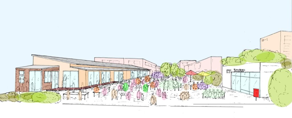 ドラフターの上で、地域の人たちが、楽しそうにコミュニケーションできる建物を思い、描いた絵になるように。