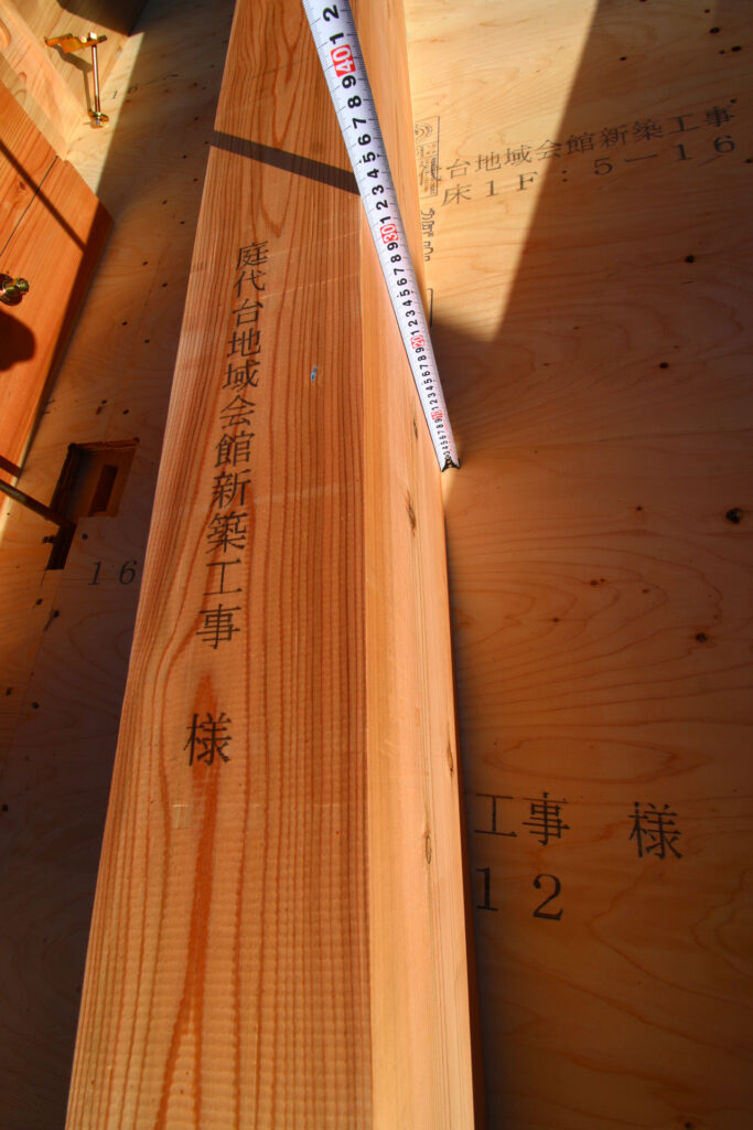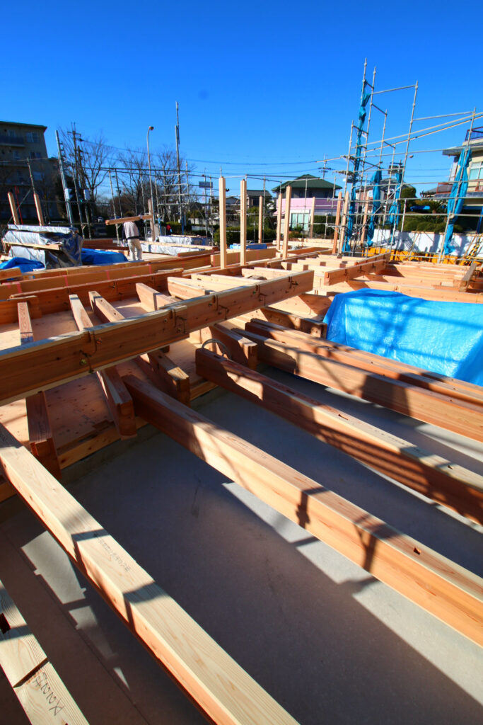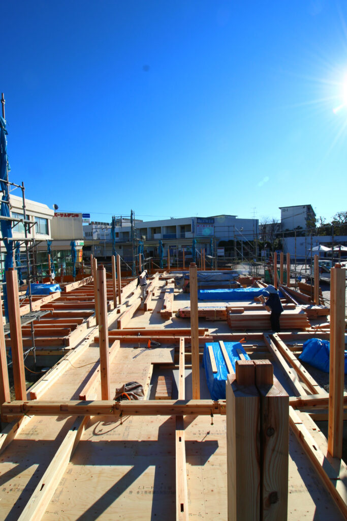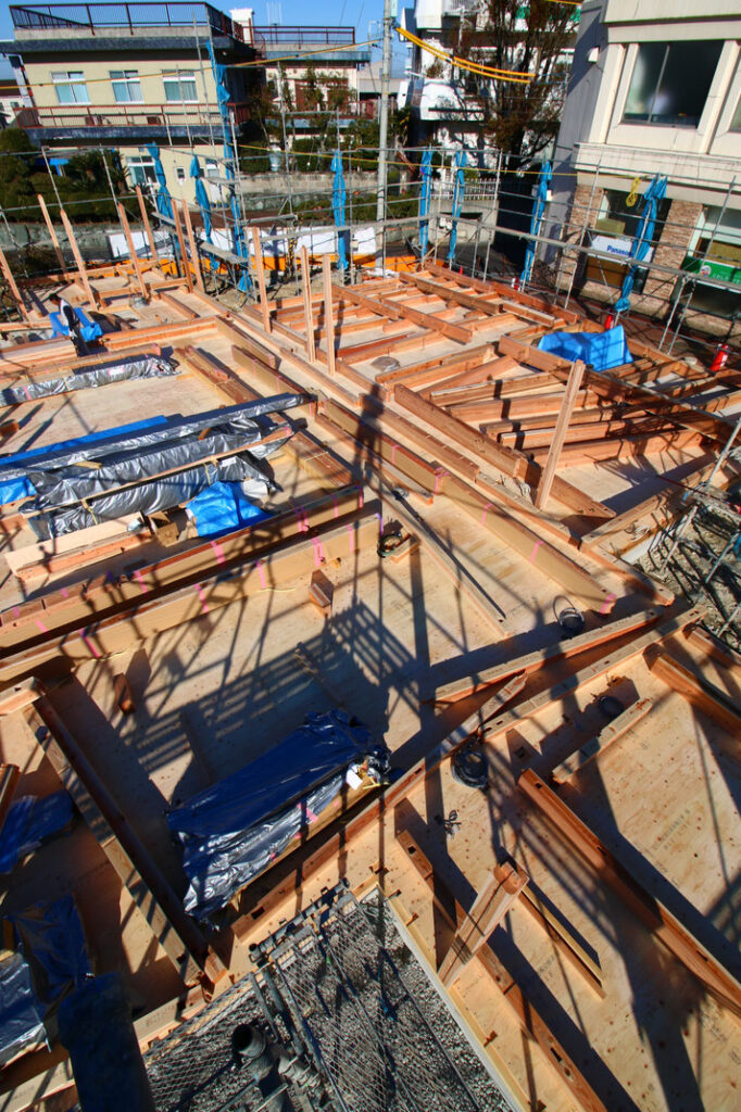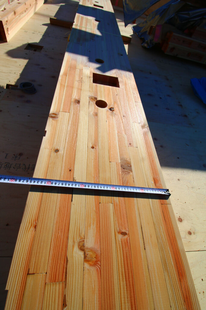 床版まで貼られた現場に、杉の構造材が所狭しと並べられてゆく。