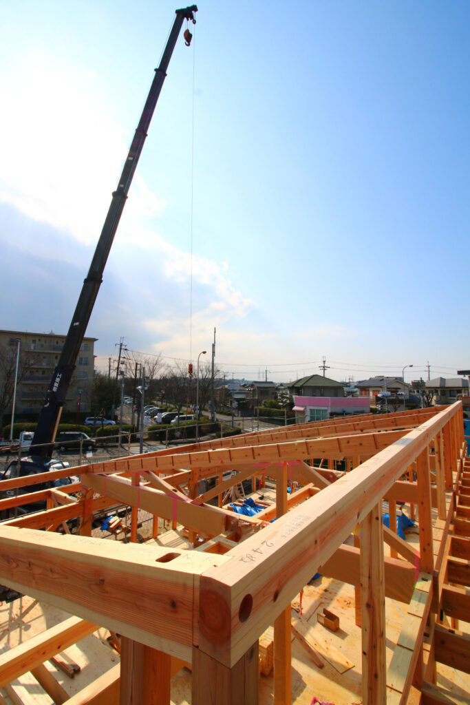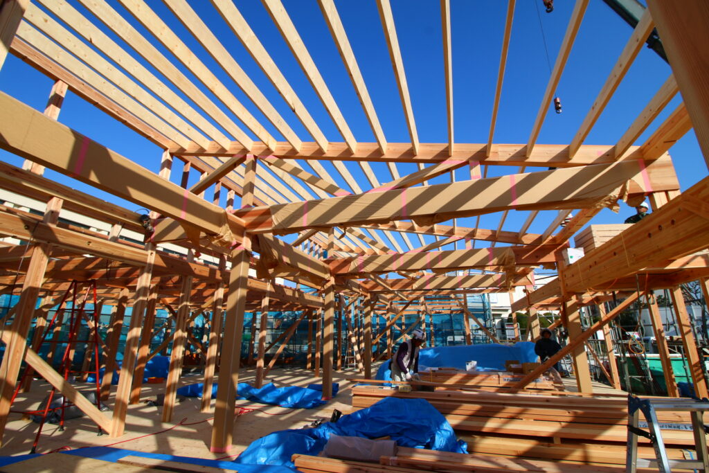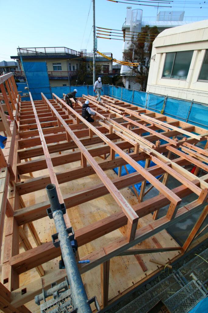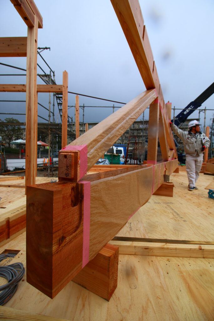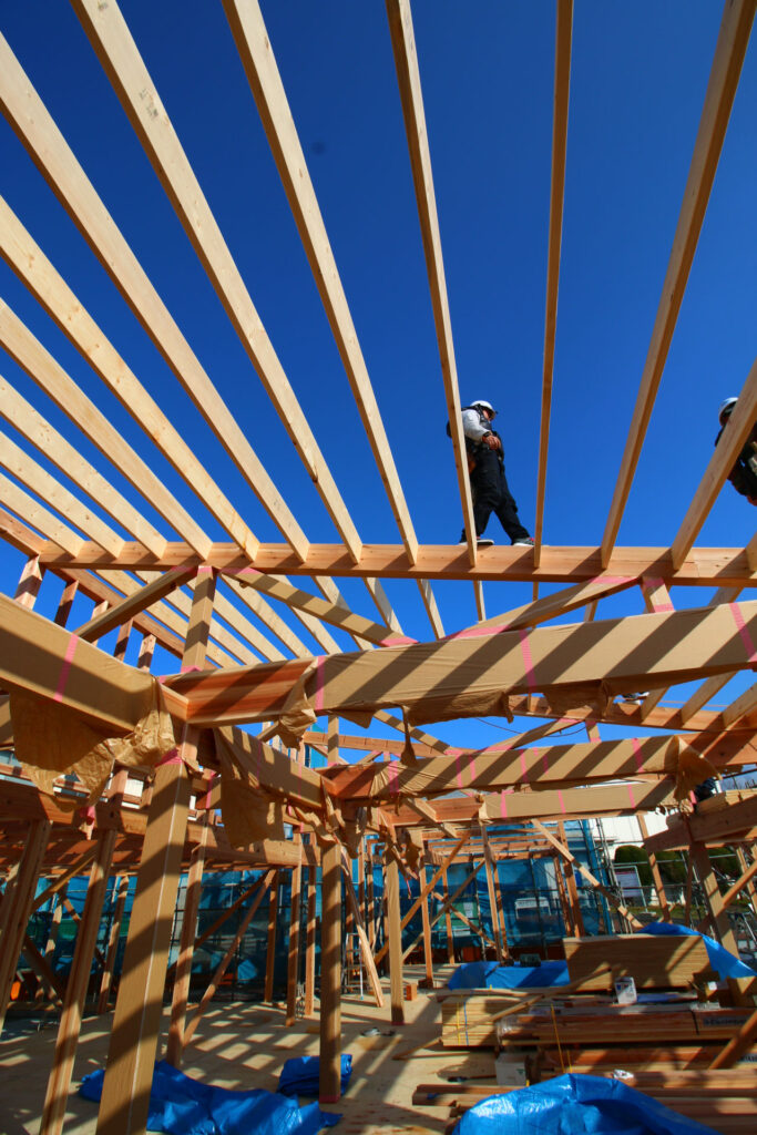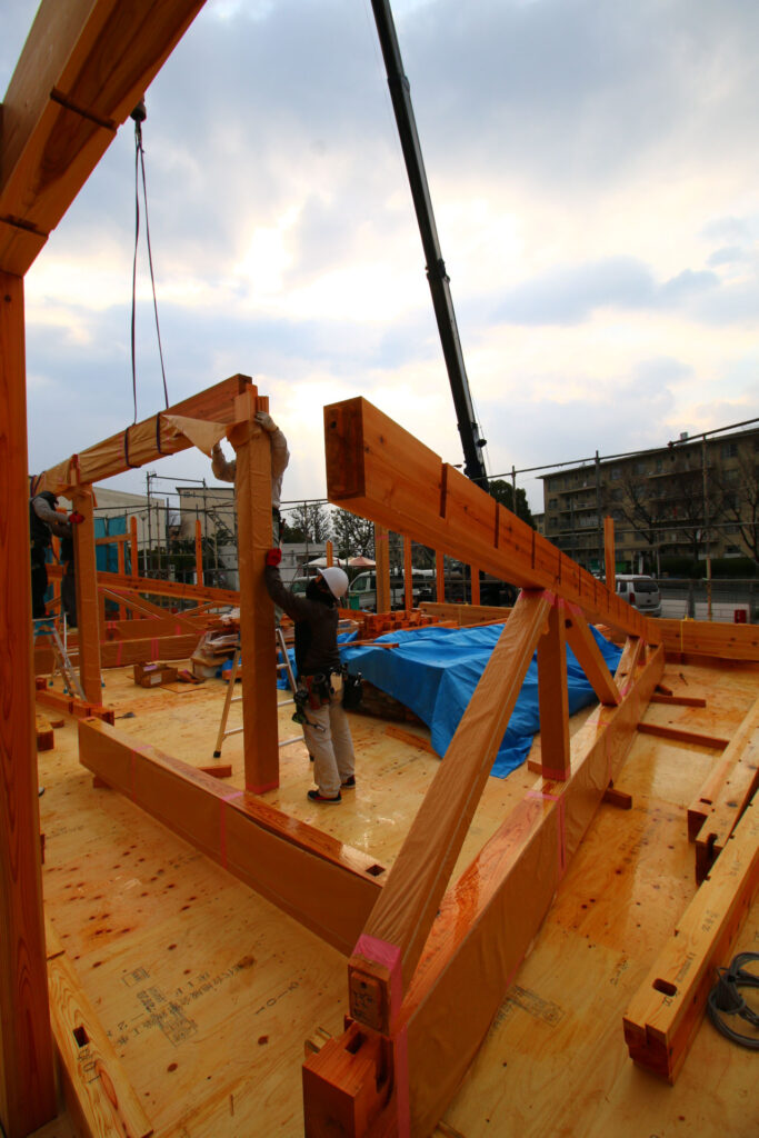 1階の柱を立てて、それに対して、順序良く梁を組んでゆく。