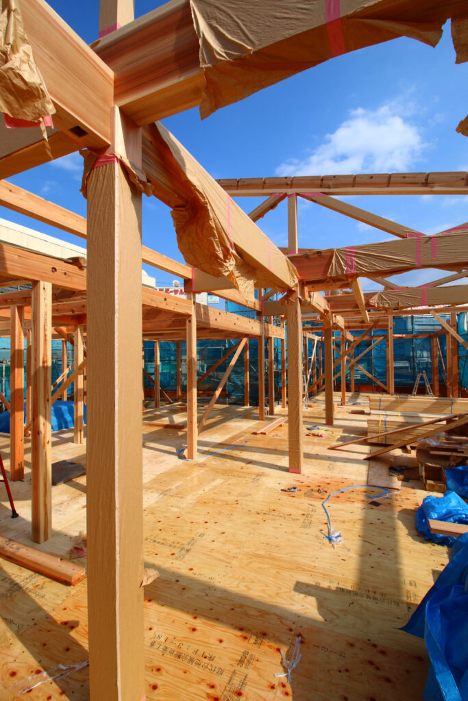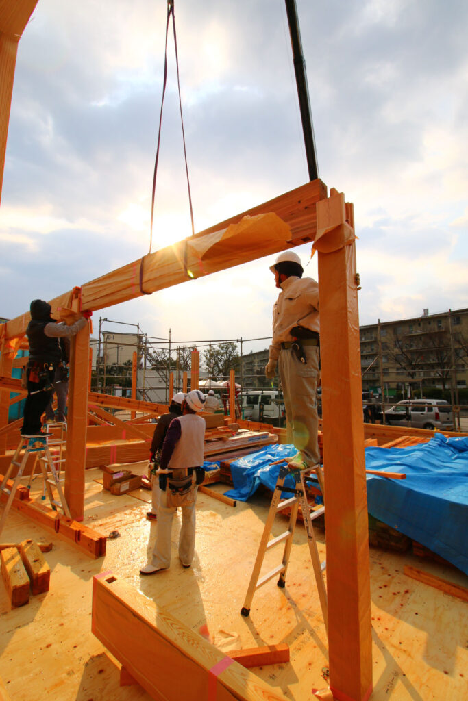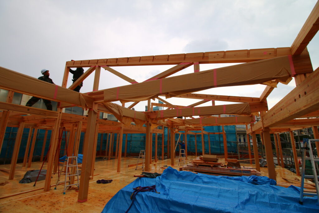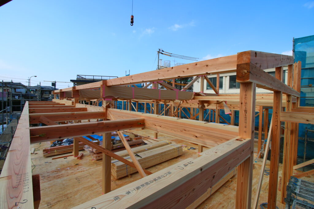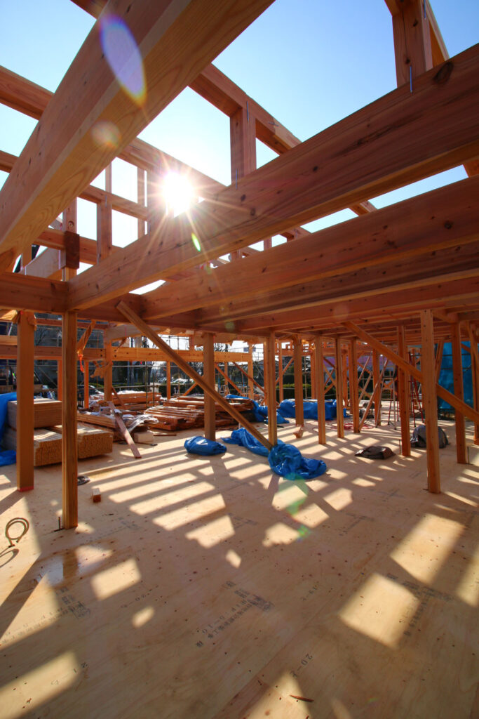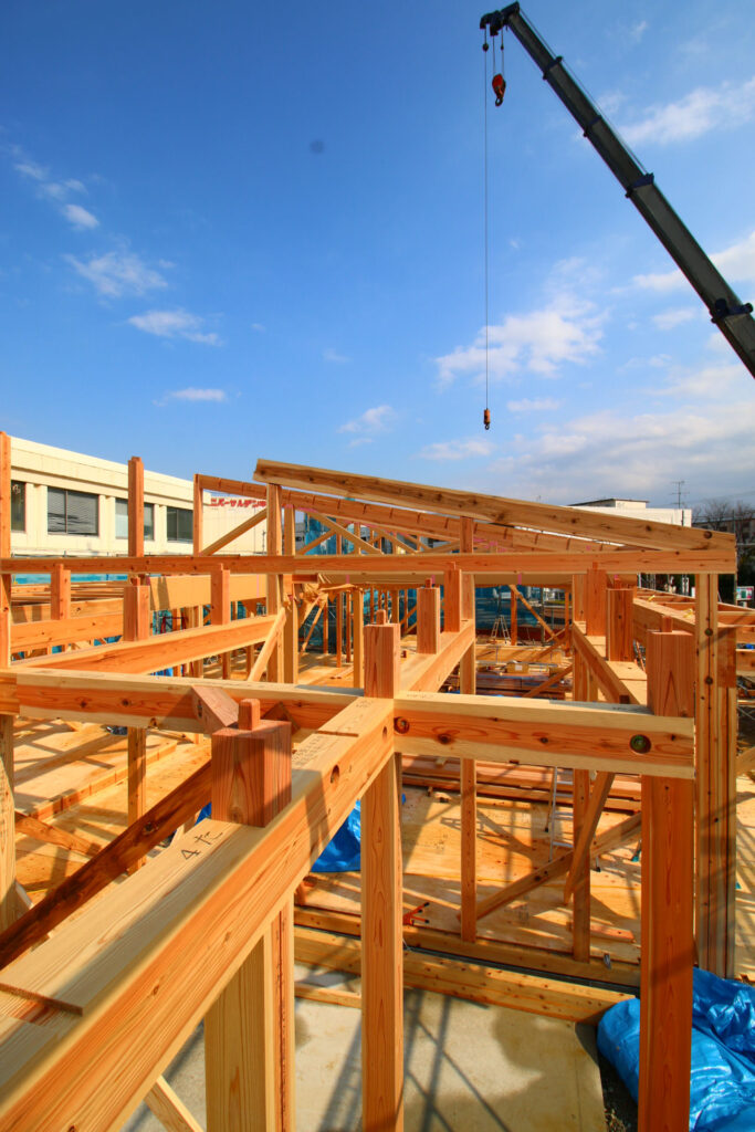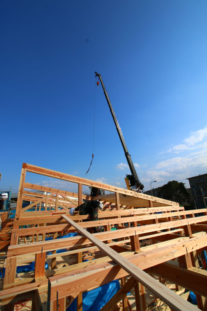 1階の柱を立てて、それに対して、順序良く梁を組んでゆく。