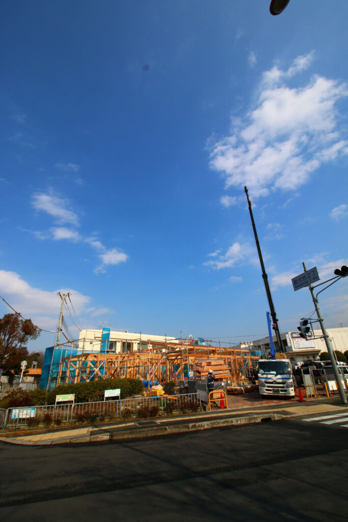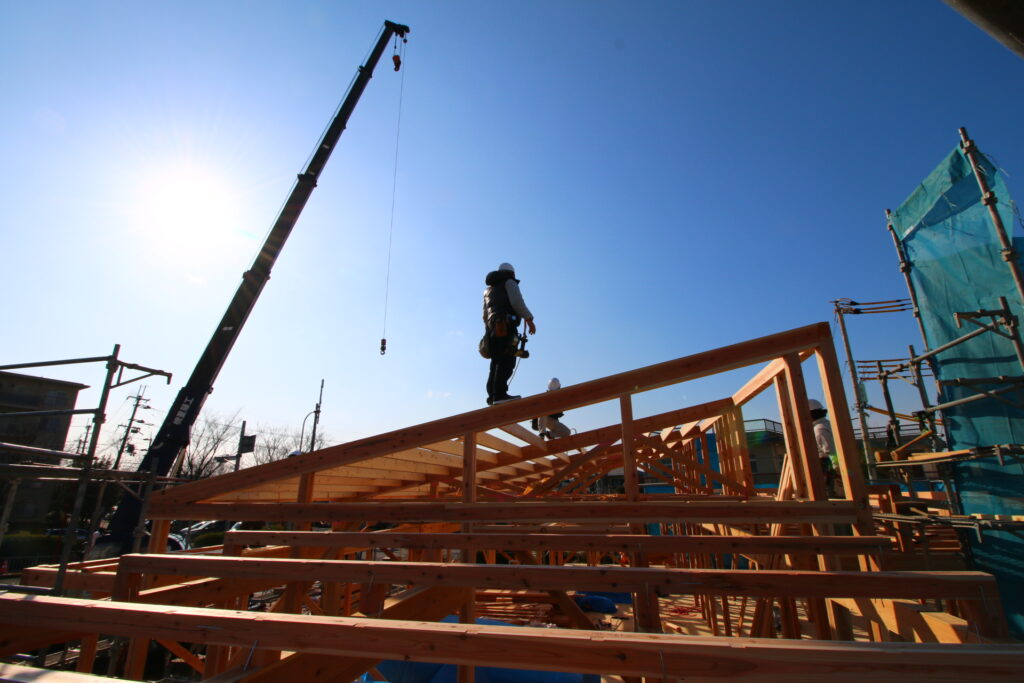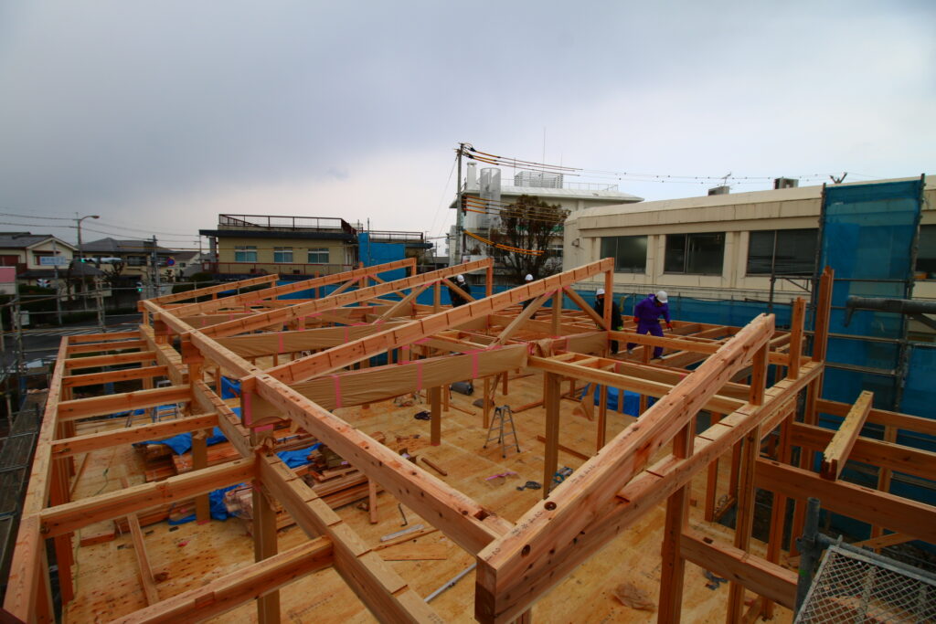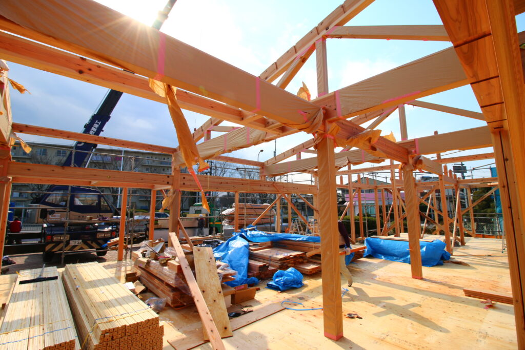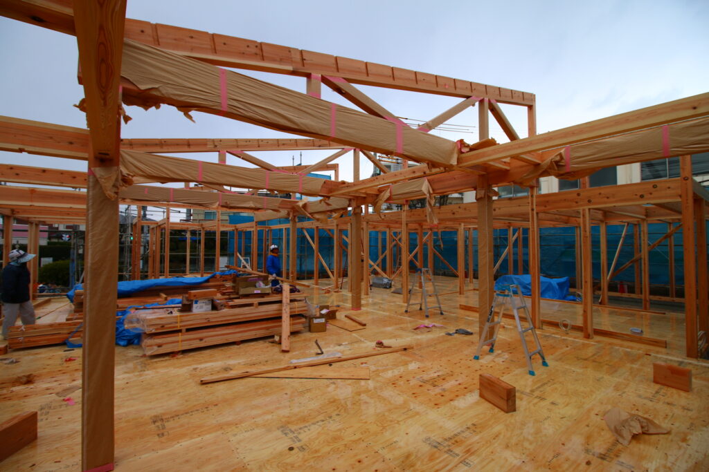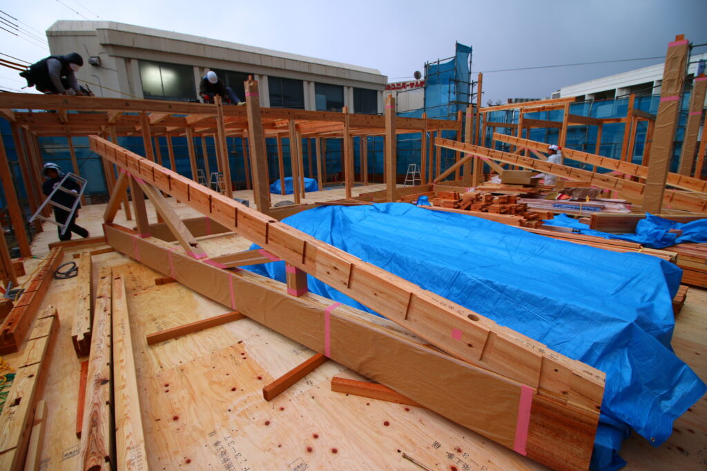 1階の柱を立てて、それに対して、順序良く梁を組んでゆく。