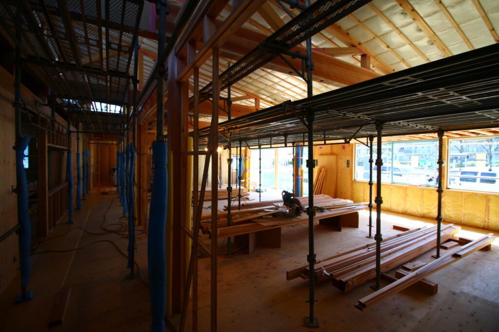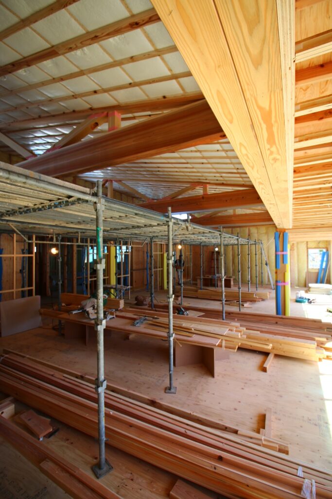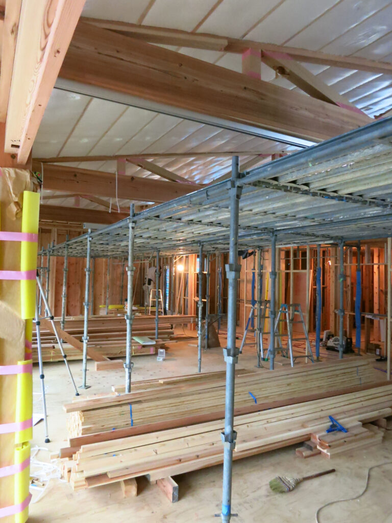 勾配屋根の空間を生かすために、内部ほぼ全域に足場を組んだ。