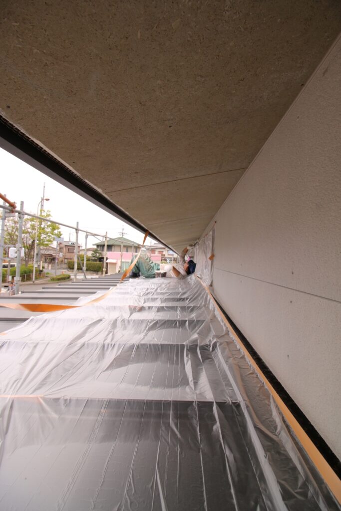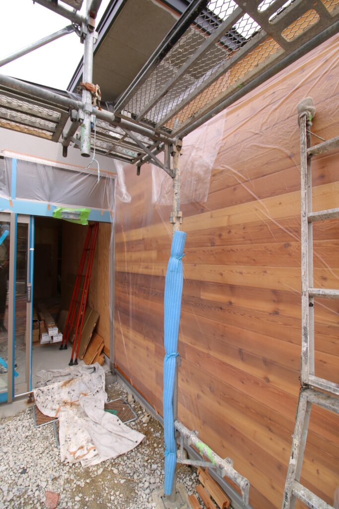 外壁左官の前に、軒天など塗装工事を先に済ませる。