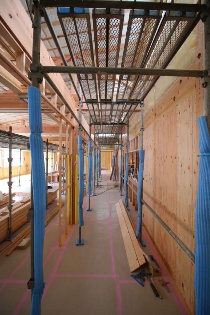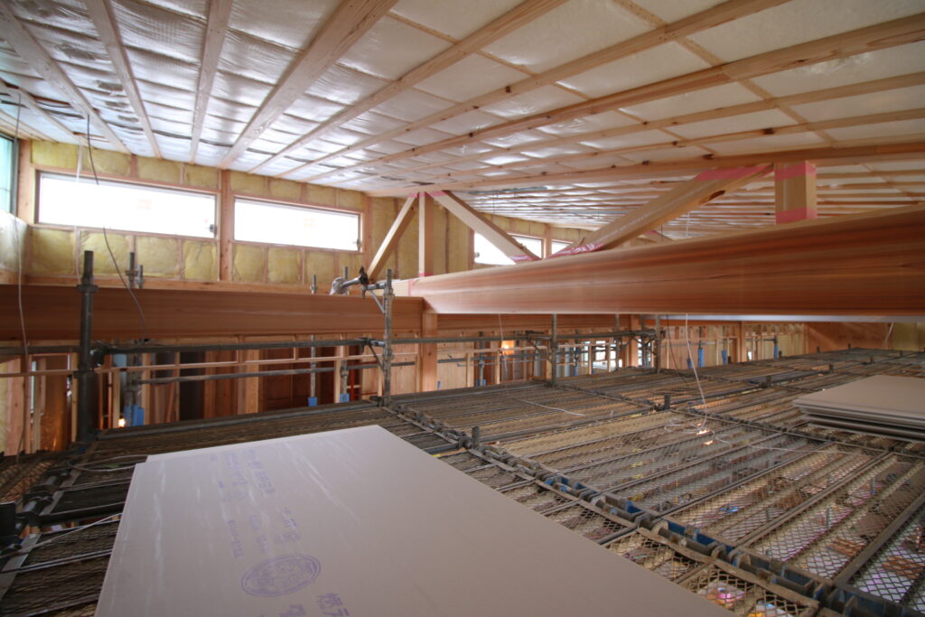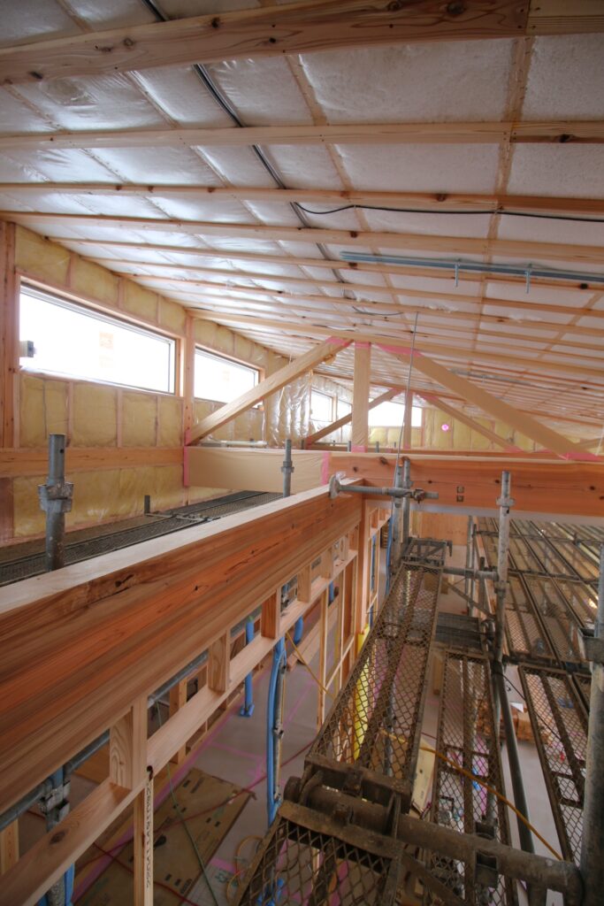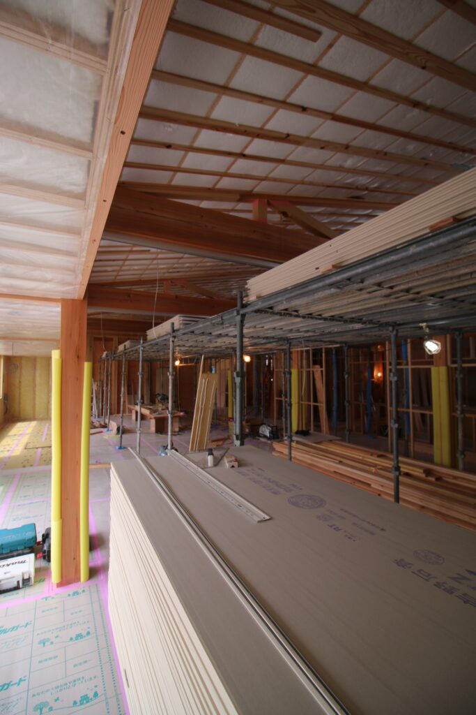 断熱材ですっぽりと建物を囲い、これから内部造作工事。