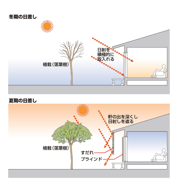 逆に夏は、太陽エネルギーは必要ないので、日射できるように考えます。