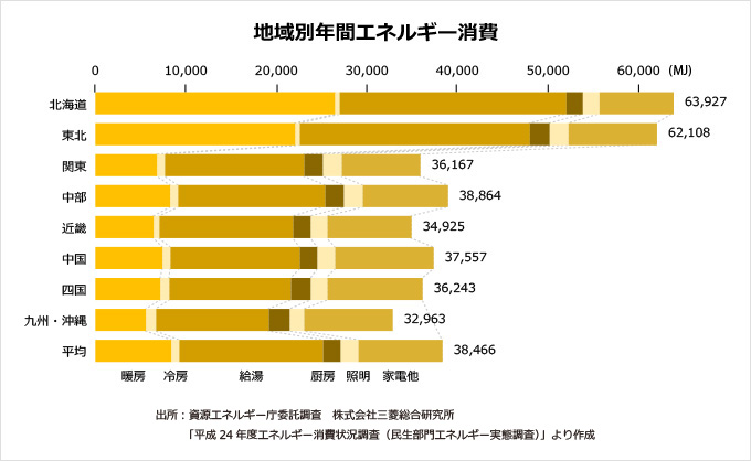 地域によってかなり差がありますが、どの地域でも、暖房と給湯がかなりエネルギーを消費します。
