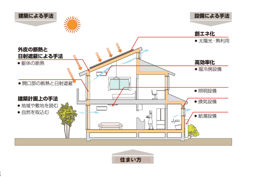 大きくは、建築による手法と設備による手法、ふたつによって、良い燃費の家を作っていきます。