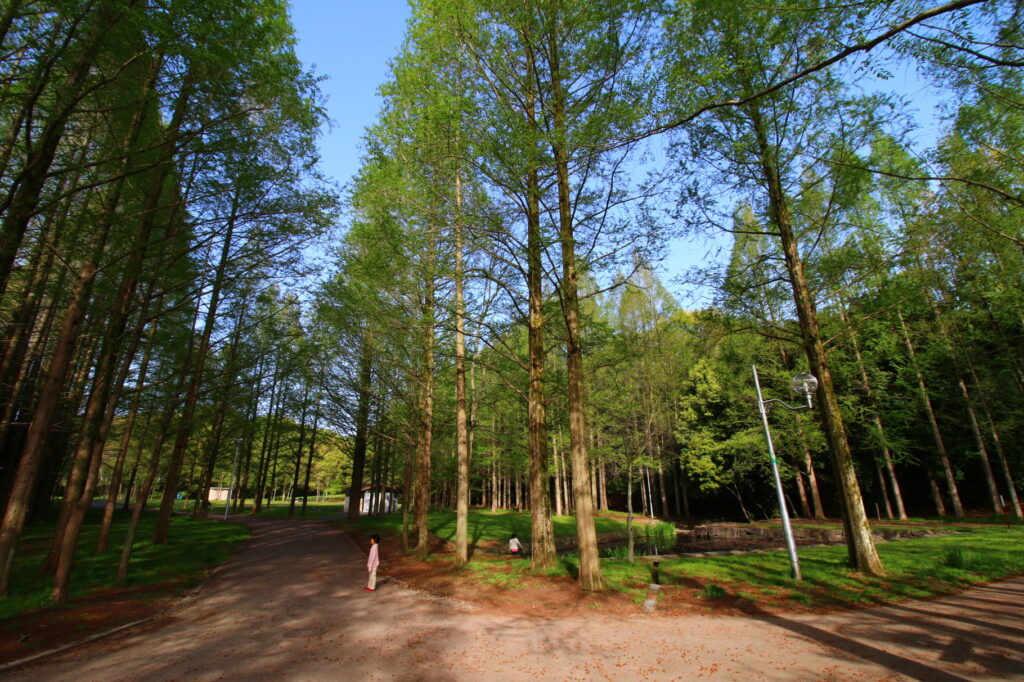 木々からは、新芽が芽吹き、すがすがしい朝の新檜尾公園。