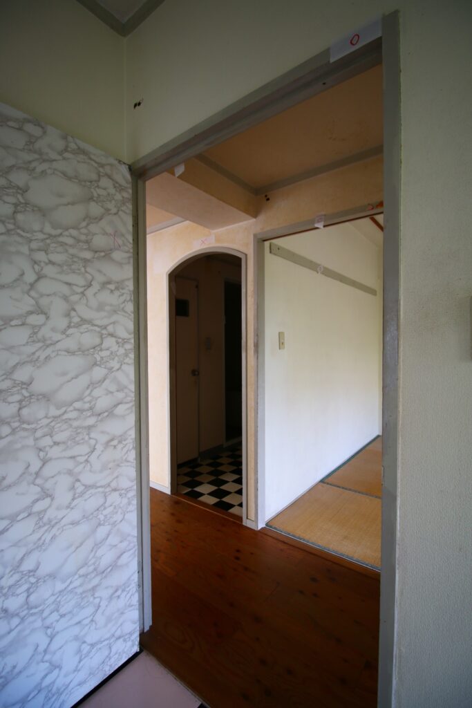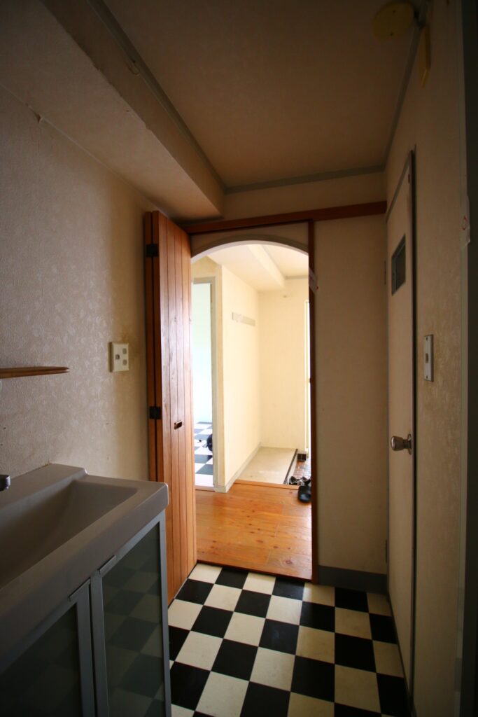 玄関突き当りの洗面所内部から、玄関を見る。