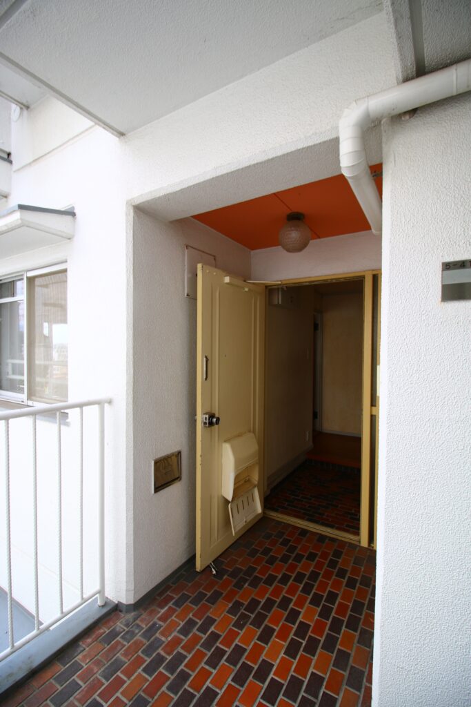 共用廊下の床タイルが、玄関の内部まで。