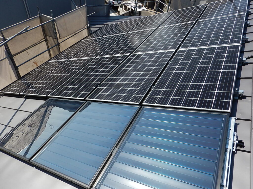 屋根上には、太陽光発電パネルと、給湯用の太陽熱給湯パネル。