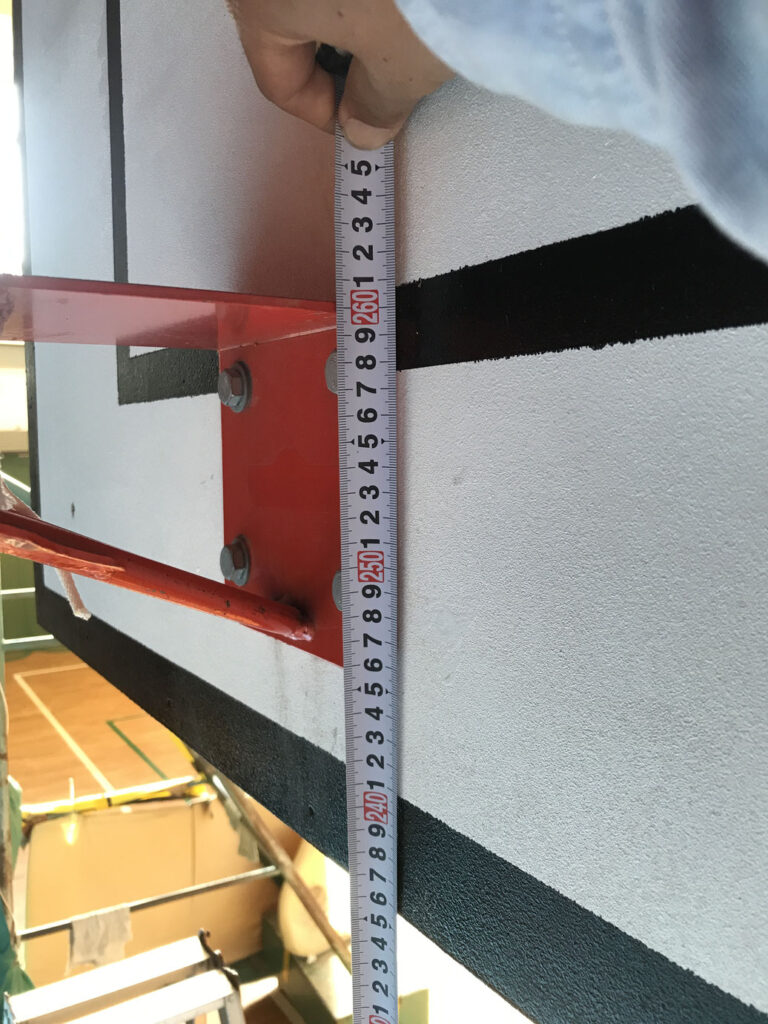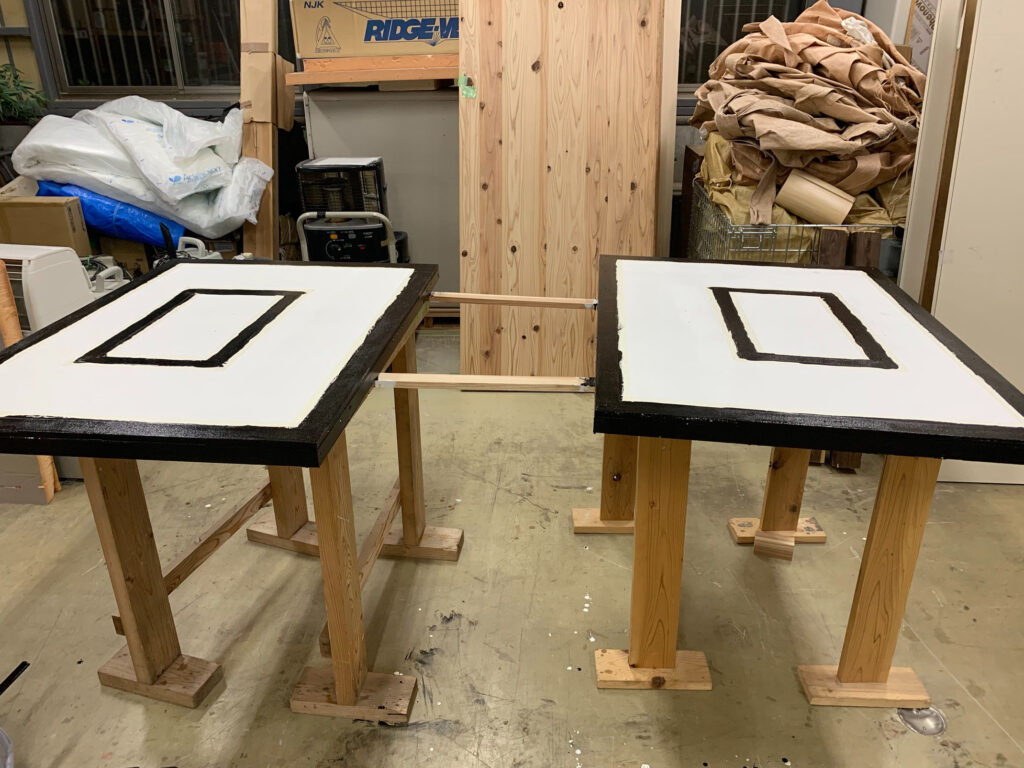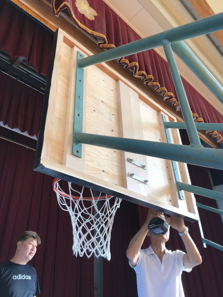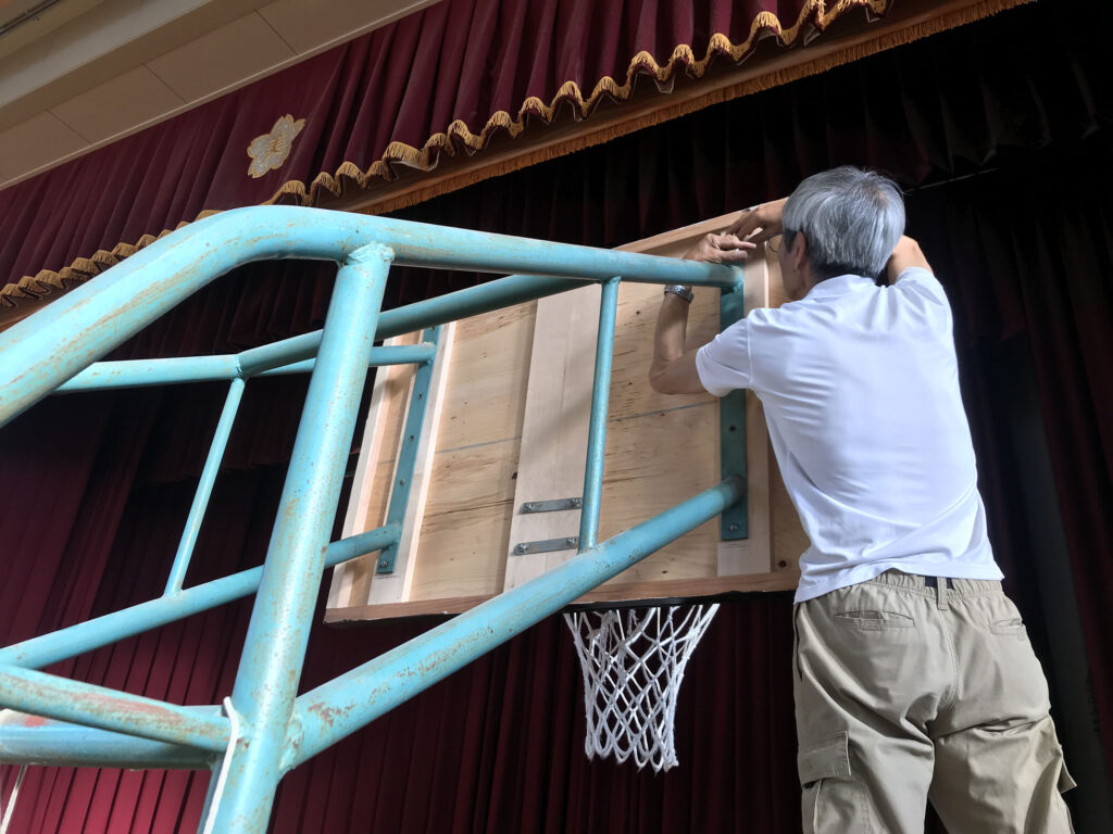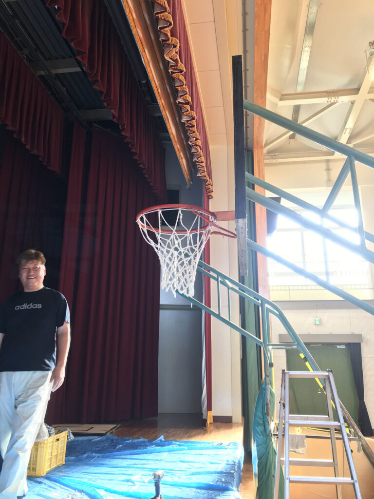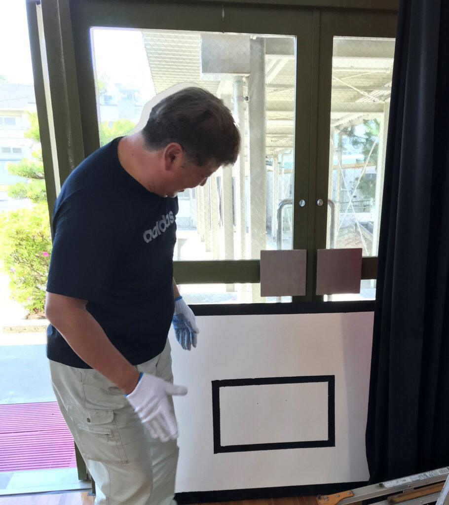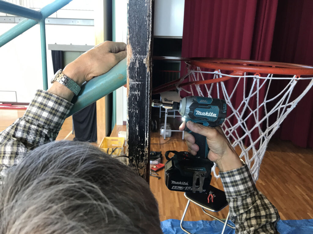 施工にあたっては、コーチの提案で、リングを舞台まで移動し、舞台上で施工。