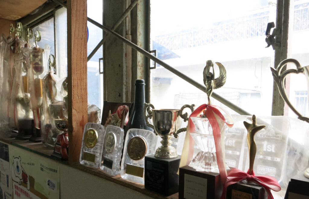 事務所にお伺いすると、所狭しと並べられたトロフィー。