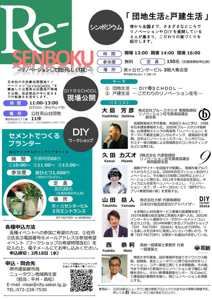 泉北ニュータウンリノベーション協議会に参画させていただき、今後増えつつある空き家の有効利用を、ソフト面(使い方)ハード面(建築不動産として)両方からも、進めてゆきます。