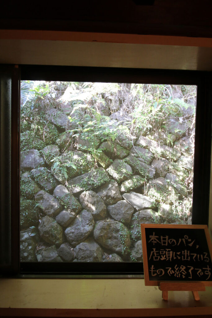 窓に接近した石垣が窓から見えるとても落ち着いた空間。