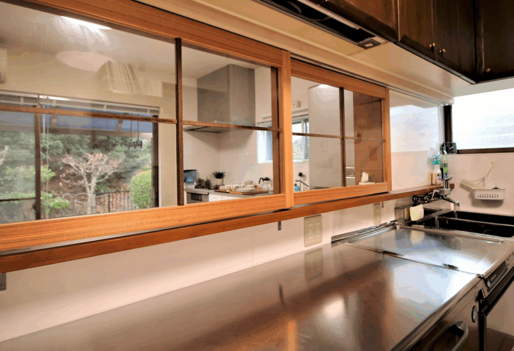 厨房からキッチンを経て緑道につながる空間は、泉北ならではの環境を生かし、