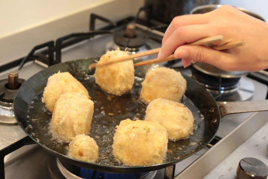 4人の共同作業、テーブルの設え、すでに下準備を終えた野菜の盛り付け、揚げ物を手際よく揚げて、印象的だったのは盛り付けする際、お皿の中の配置や色合いのバランスを見ながら丁寧に配置されていて。