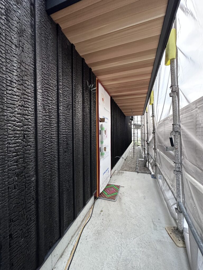 北側道路からのファサードには、ほっくほくに焼かれた杉板が印象的です。玄関入って少し低めの天井高さの玄関ホールにはグランドピアノが。
