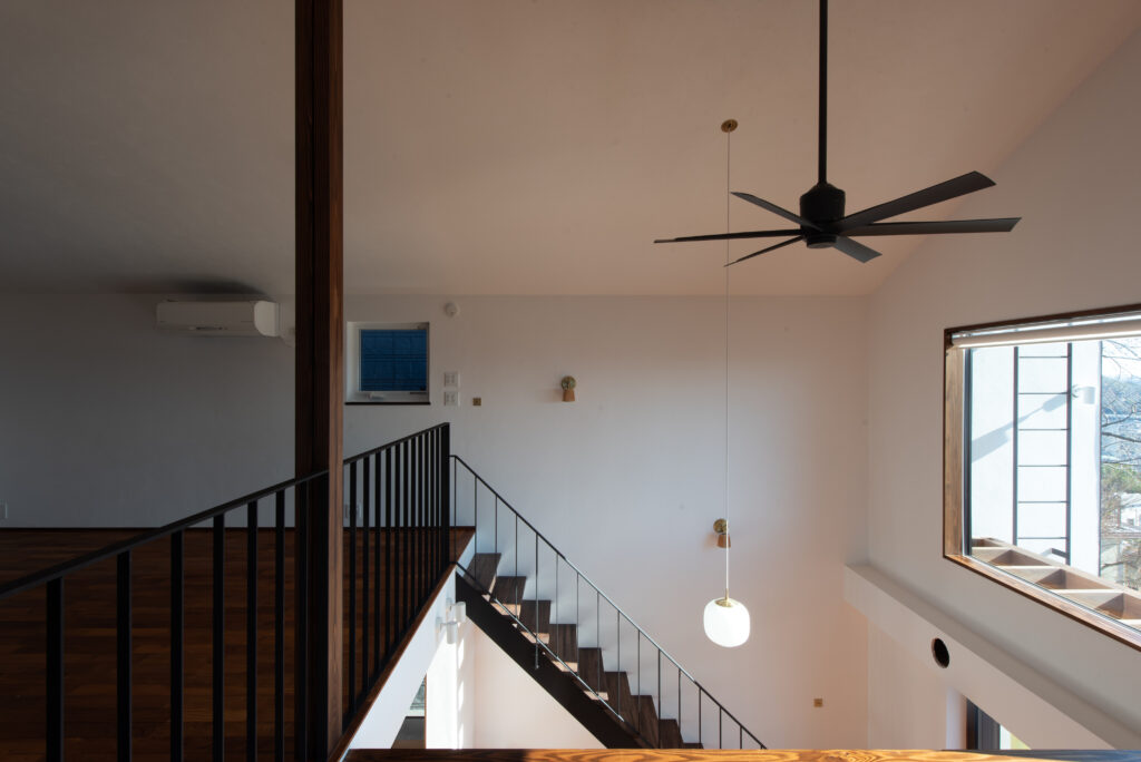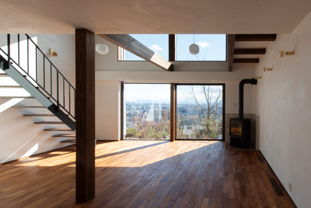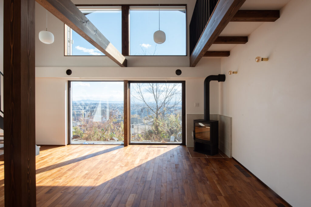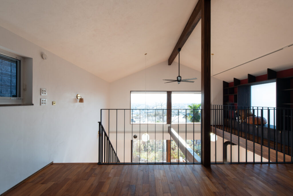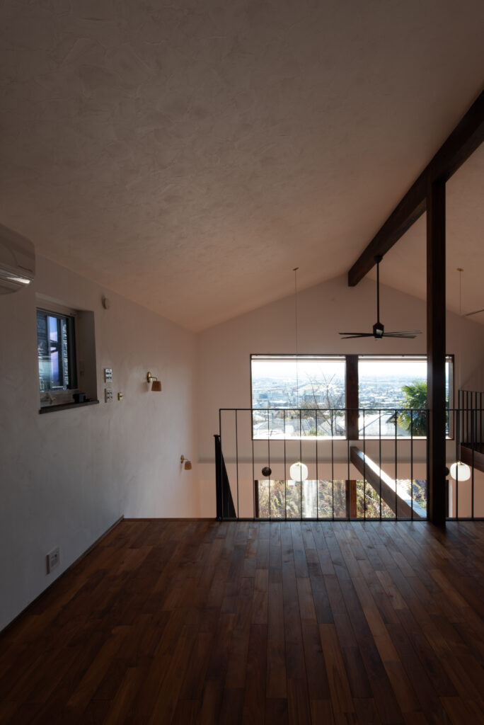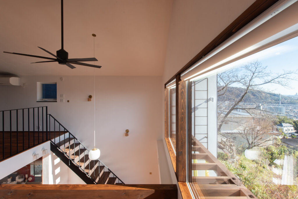 The site faces south and offers a panoramic view of all of Osaka. The façade seen from the road on the north side has impressively carved cedar boards. There is a grand piano in the entrance hall with a slightly low ceiling. From there, when you are drawn into the living room, the calm atmosphere changes completely, creating a bright and airy space. Once you go through the atrium and go up the stairs, there are many places to stay. The view that can be seen through the wooden sash also changes colors depending on the season and time, which is one of the finishing touches of this house. Dynamic plan structure and carefully selected materials. This is a wooden house that expresses a lot of our individuality.