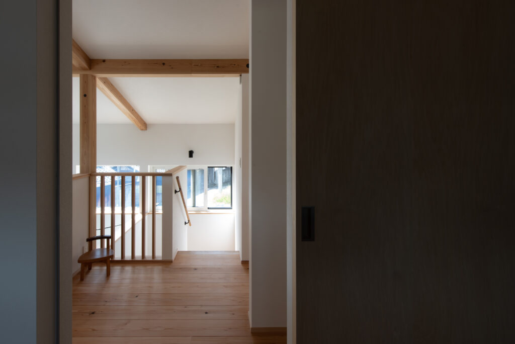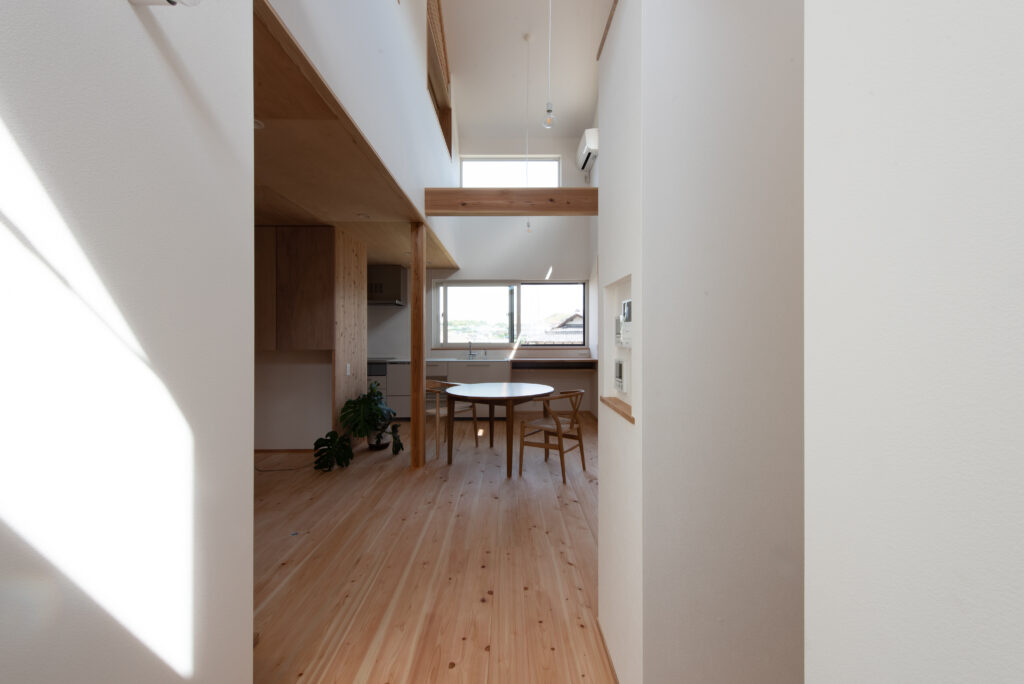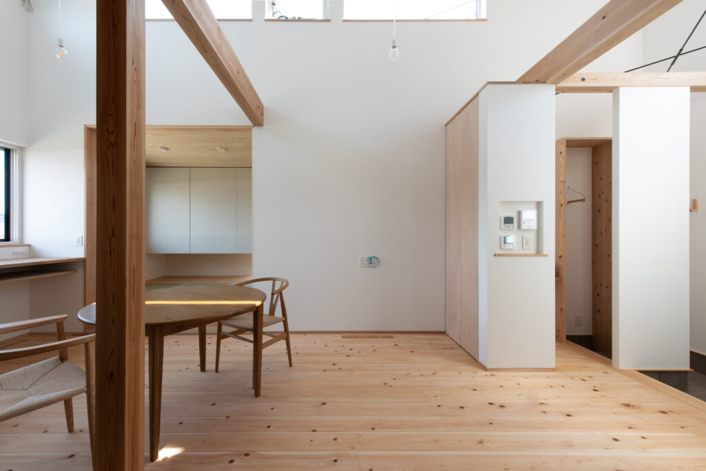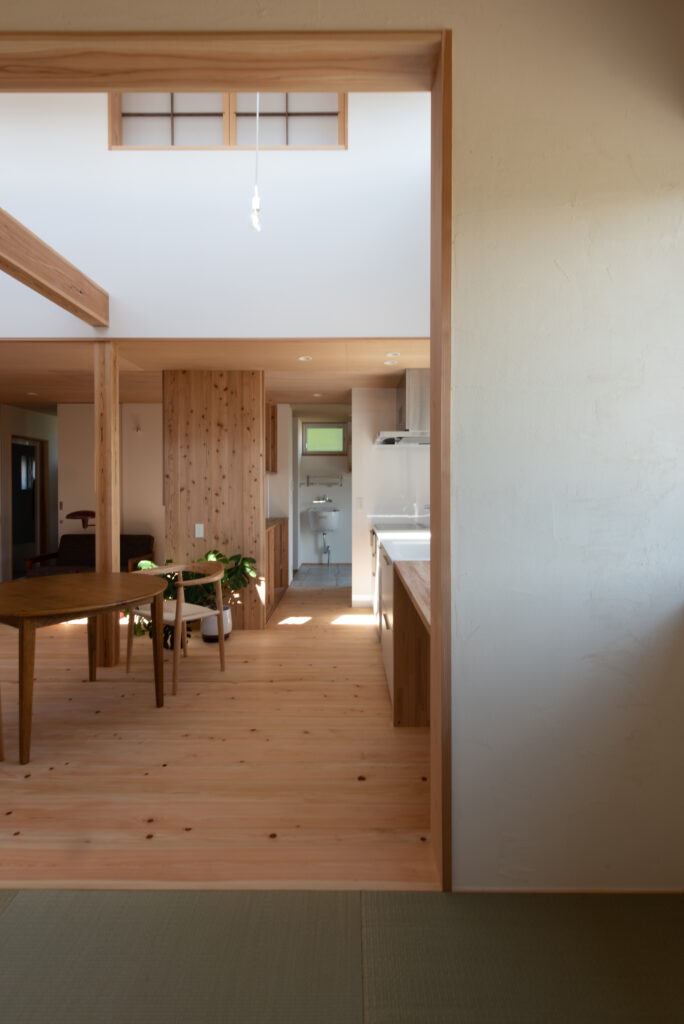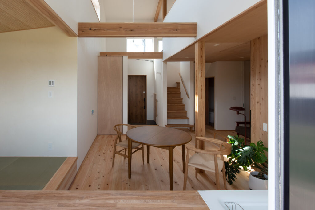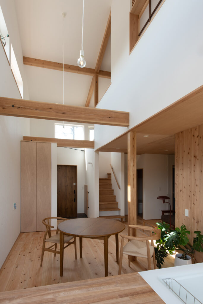 A site surrounded by Japanese countryside scenery, I want to have a potager garden here. Ever since we first met, I have been told about this dream. A ZEH house that is highly airtight, highly insulated, and equipped with solar power generation. When you enter through the south-facing entrance, gentle light pours down from the large atrium, and your line of sight is directed toward the north-facing potager garden. The plan was not based on the assumption that the building would open wide to the south, but rather considered the plan structure, space, functionality, and usability based on the site conditions and requests. As the scene progresses, I feel a sense of freshness.