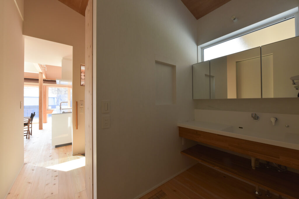 浴室で脱いだ服が、洗濯機に行って洗濯され、乾燥機か干されて、収納され、また着る。当たり前の流れですが、それをどこでどのように暮らしに当てはめてゆくのか、いろんな家族のこだわりが、発揮されるところです。