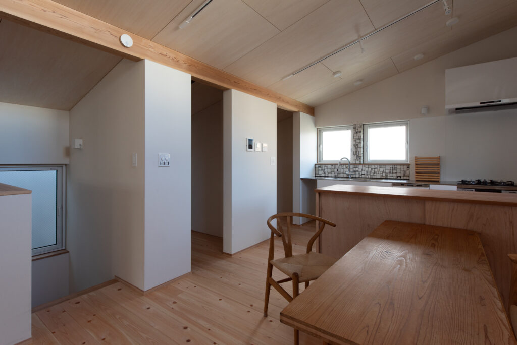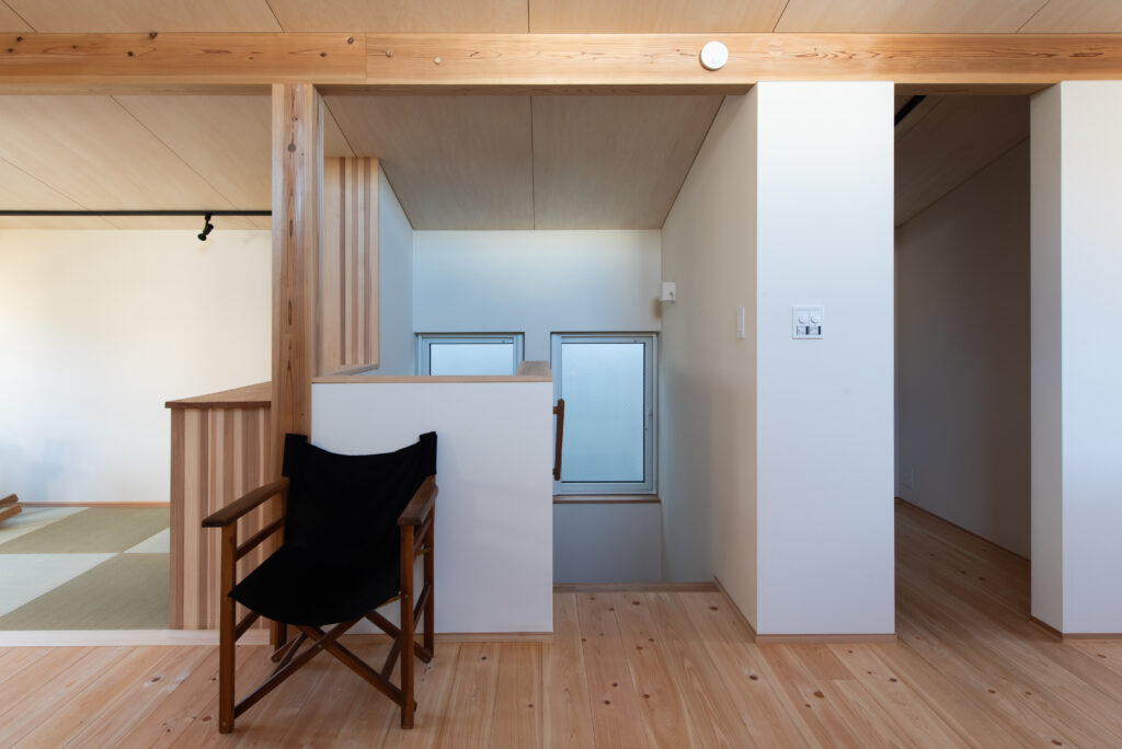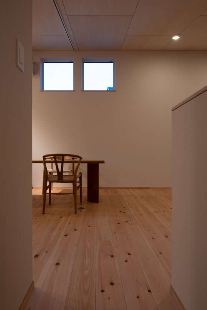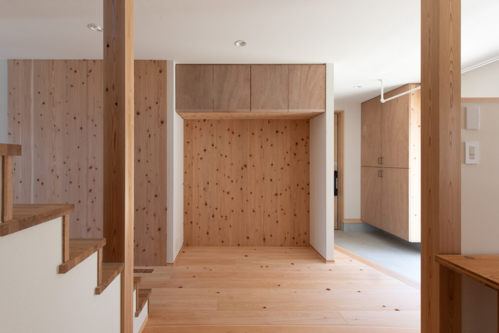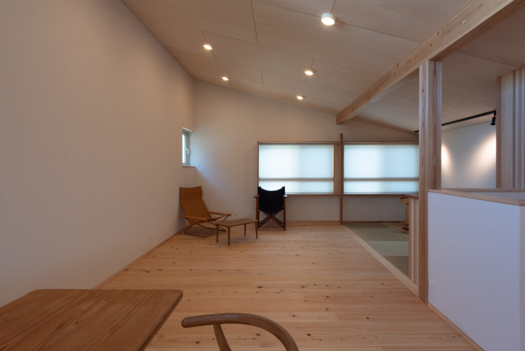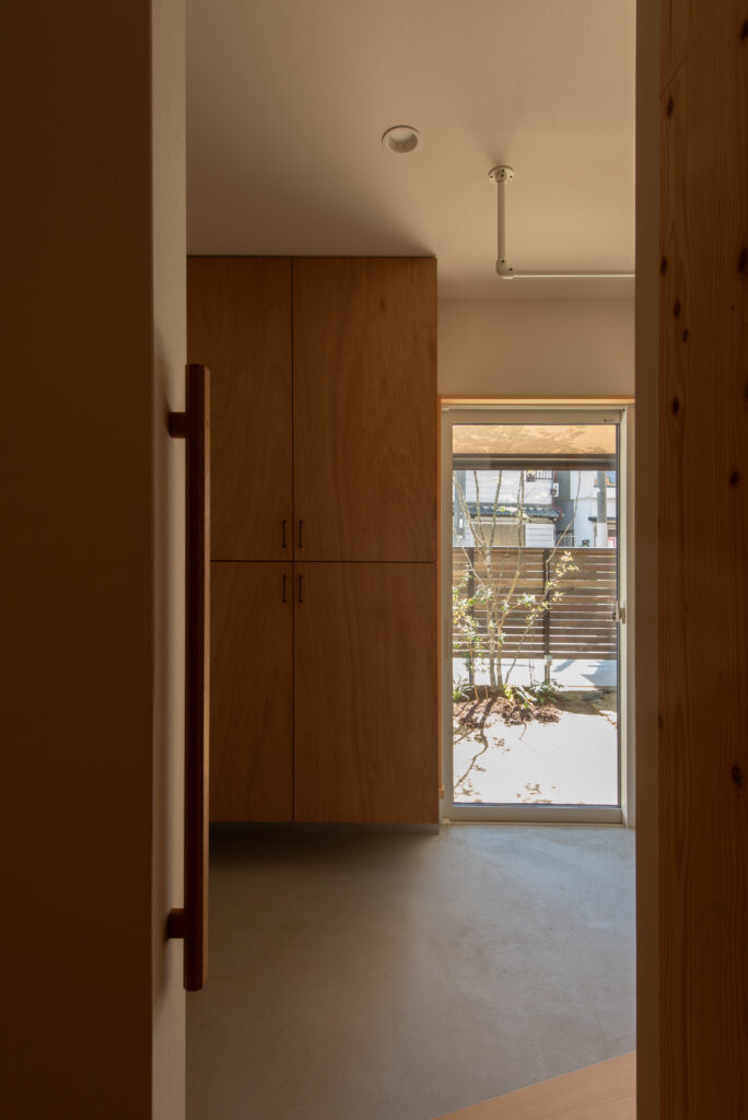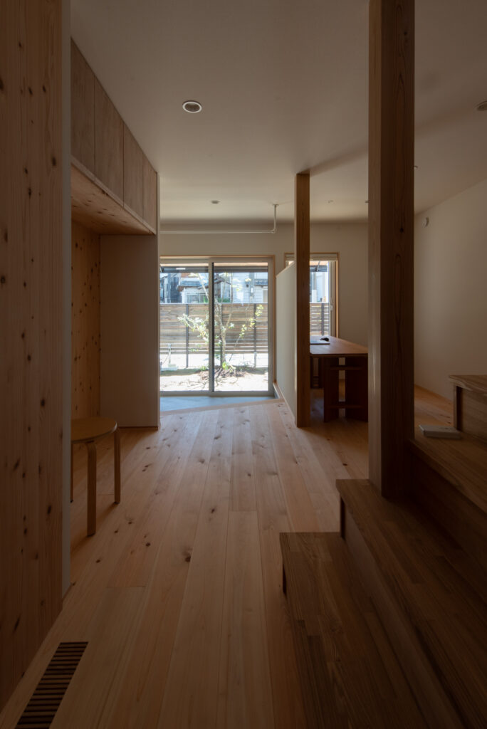 The site faces roads on both the north and south sides. There’s parking for two cars on the south side, and you can see the private garden and vegetable patch as you approach the front door.The two-story plan is structurally advantageous and simple to maintain.The first floor features a dirt floor, study, bedroom, family closet, laundry room, and bathroom. The second floor features a living room, dining room, kitchen, tatami space, and storage.The entrance dirt floor is a major feature. Leaving a little more space at the entrance, this space is surrounded by a wooden fence that blocks views from the road, creating a tranquil, private space. This dirt floor serves as a hub to the study, closet, and foyer. It’s envisioned as a place to relax, play music, or just hang out. While it’s common for homes to connect to the outdoors from the living room, the unique feature of this home is that the dirt floor, located outside the living room, connects to the outdoors and allows for a rich lifestyle while enjoying the changing seasons.The study is designed to feel semi-detached from the rest of the house. Having a function other than residence creates a sense of freshness. It connects to the entrance hall and the garden. Separated from the main living area, it’s the perfect place to work.The “family closet” continues from the entrance. This is the basic flow line for when people get home, securing their clothes and storage before passing through it to the bathroom. This flow line is also important for laundry.The “bedroom” and “children’s room” are located at the back of the first floor. The children’s room is designed to be flexible for future use.Upstairs to the second floor is a large space with a sloped ceiling. The kitchen, dining room, and living room are connected next to each other. The kitchen has a wall-type kitchen facing north. Counter storage is installed to gently separate the kitchen area. The kitchen has an adjacent pantry, approximately 2.5 tatami mats in size, which is utilized to keep the kitchen tidy. The storage space next to the pantry is filled with hobby items, providing not only storage but also a comfortable feeling of being secluded in this small space.Counter storage is installed along the wall leading from the kitchen to the dining room and living room. Our goal is to provide ample storage for everyday items, children’s homework and writing materials, and television and audio equipment, allowing for a tidy and organized living space. Storage rooms and counter space have also been maximized to keep everyday areas clutter-free.The kitchen is designed for standing, the dining area for seating, and the sofa and tatami area are designed for seating. This is a place where you can lounge around on a regular basis. In winter, sunlight pours in brilliantly through the south-facing waist-high windows, creating the ultimate relaxing space.Functional, beautiful, and fun. This is the concept.It’s not particularly large, but it has a spacious feel, allowing the family to live freely.