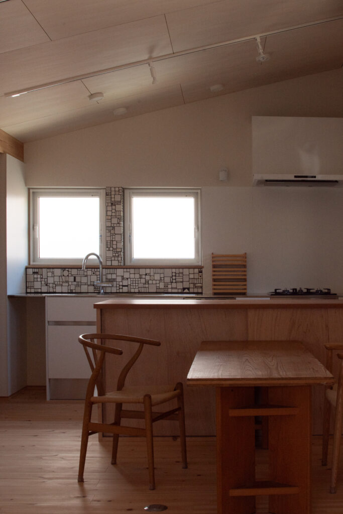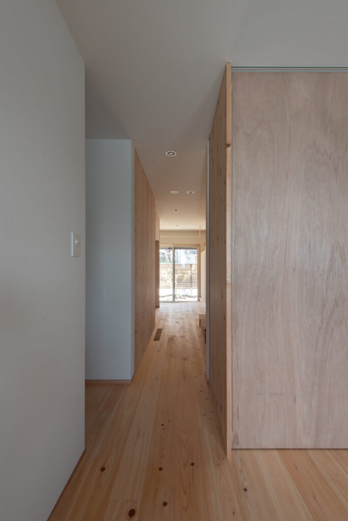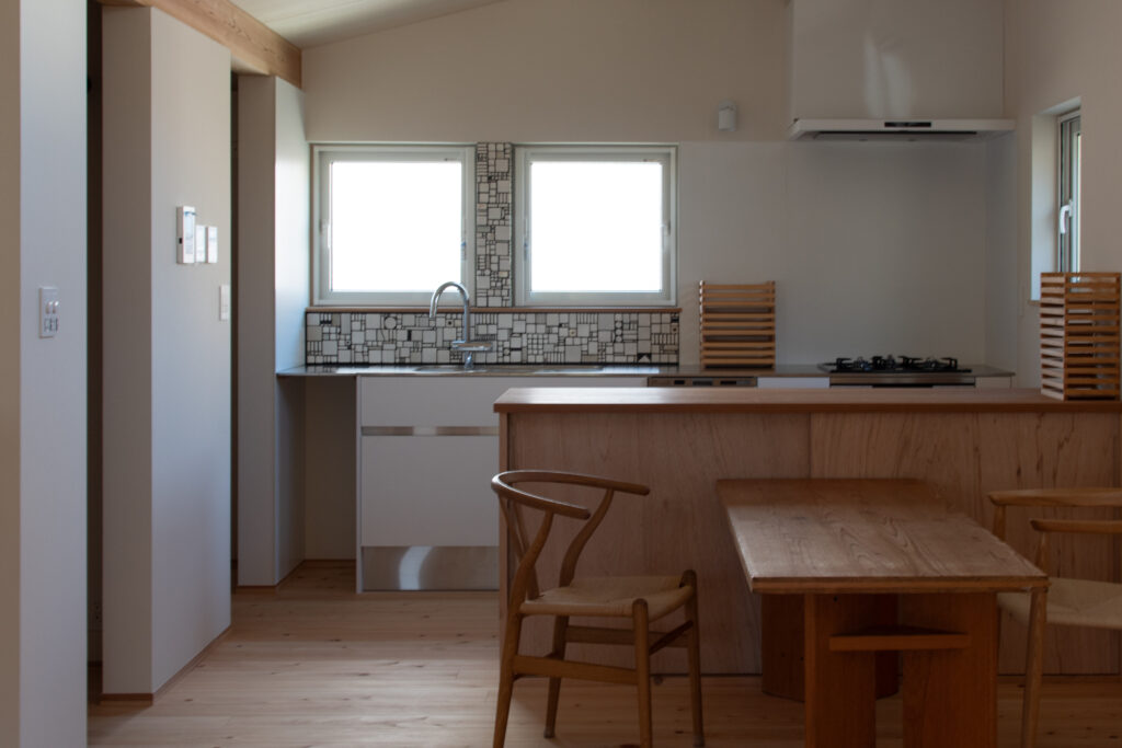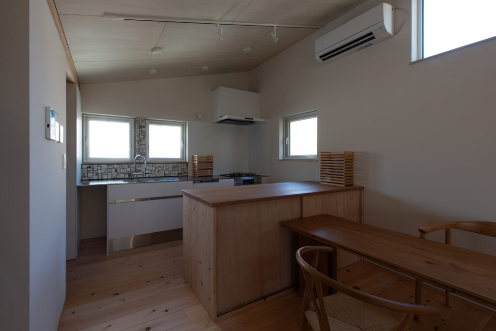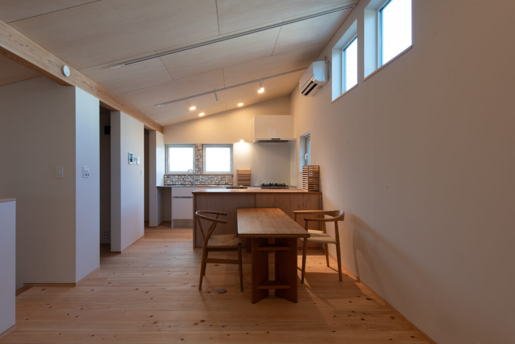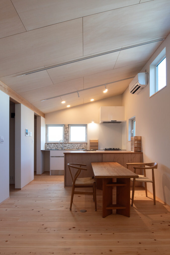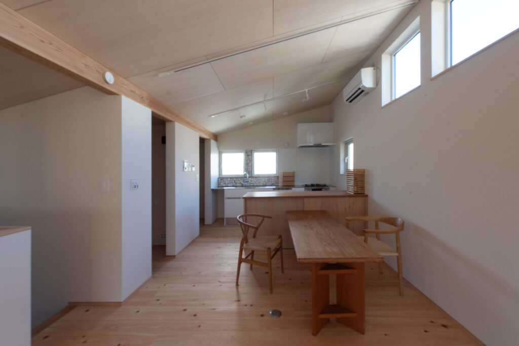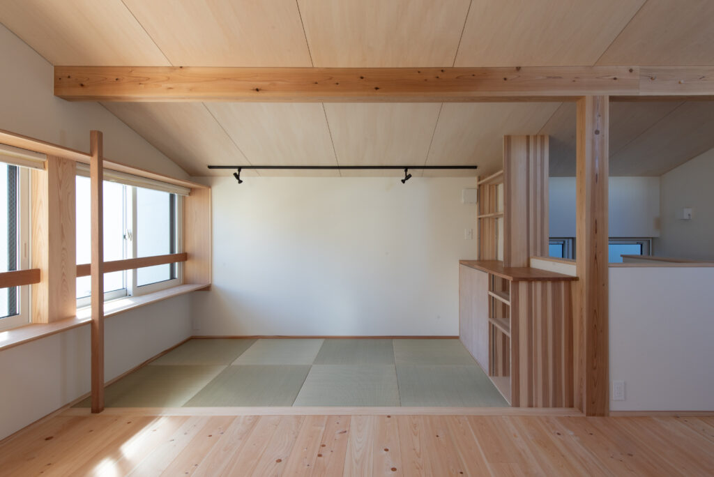The site faces roads on both the north and south sides. There’s parking for two cars on the south side, and you can see the private garden and vegetable patch as you approach the front door.The two-story plan is structurally advantageous and simple to maintain.The first floor features a dirt floor, study, bedroom, family closet, laundry room, and bathroom. The second floor features a living room, dining room, kitchen, tatami space, and storage.The entrance dirt floor is a major feature. Leaving a little more space at the entrance, this space is surrounded by a wooden fence that blocks views from the road, creating a tranquil, private space. This dirt floor serves as a hub to the study, closet, and foyer. It’s envisioned as a place to relax, play music, or just hang out. While it’s common for homes to connect to the outdoors from the living room, the unique feature of this home is that the dirt floor, located outside the living room, connects to the outdoors and allows for a rich lifestyle while enjoying the changing seasons.The study is designed to feel semi-detached from the rest of the house. Having a function other than residence creates a sense of freshness. It connects to the entrance hall and the garden. Separated from the main living area, it’s the perfect place to work.The “family closet” continues from the entrance. This is the basic flow line for when people get home, securing their clothes and storage before passing through it to the bathroom. This flow line is also important for laundry.The “bedroom” and “children’s room” are located at the back of the first floor. The children’s room is designed to be flexible for future use.Upstairs to the second floor is a large space with a sloped ceiling. The kitchen, dining room, and living room are connected next to each other. The kitchen has a wall-type kitchen facing north. Counter storage is installed to gently separate the kitchen area. The kitchen has an adjacent pantry, approximately 2.5 tatami mats in size, which is utilized to keep the kitchen tidy. The storage space next to the pantry is filled with hobby items, providing not only storage but also a comfortable feeling of being secluded in this small space.Counter storage is installed along the wall leading from the kitchen to the dining room and living room. Our goal is to provide ample storage for everyday items, children’s homework and writing materials, and television and audio equipment, allowing for a tidy and organized living space. Storage rooms and counter space have also been maximized to keep everyday areas clutter-free.The kitchen is designed for standing, the dining area for seating, and the sofa and tatami area are designed for seating. This is a place where you can lounge around on a regular basis. In winter, sunlight pours in brilliantly through the south-facing waist-high windows, creating the ultimate relaxing space.Functional, beautiful, and fun. This is the concept.It’s not particularly large, but it has a spacious feel, allowing the family to live freely.