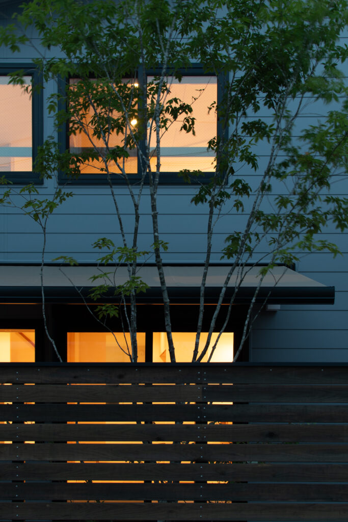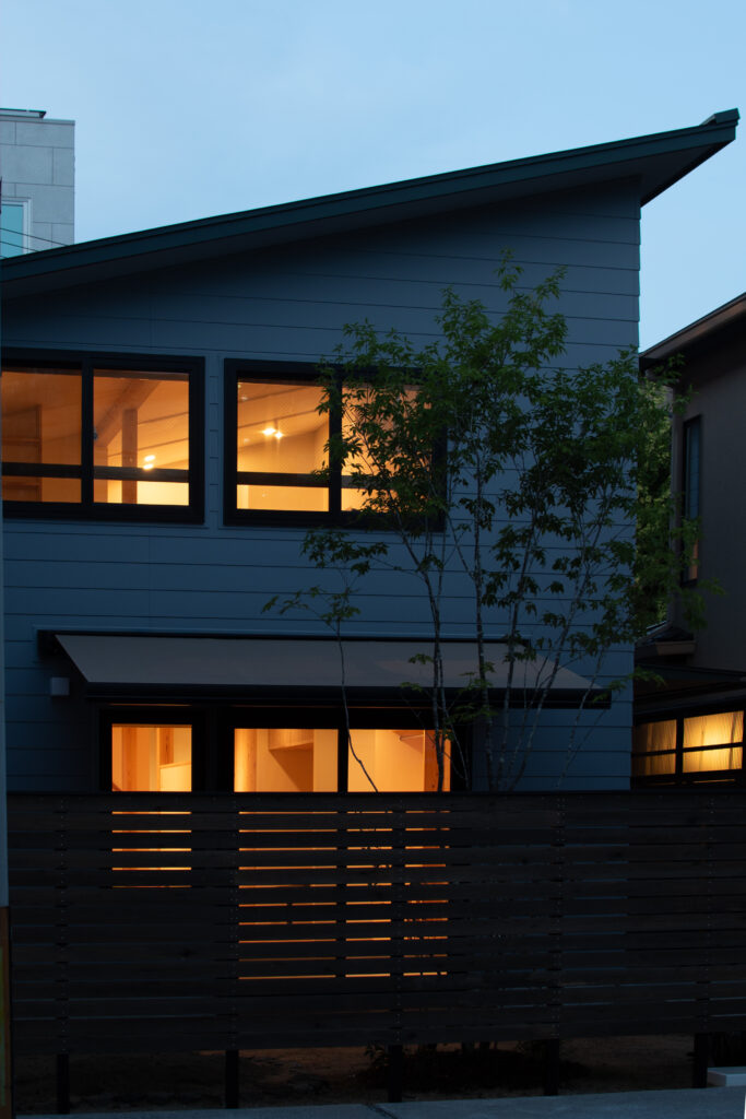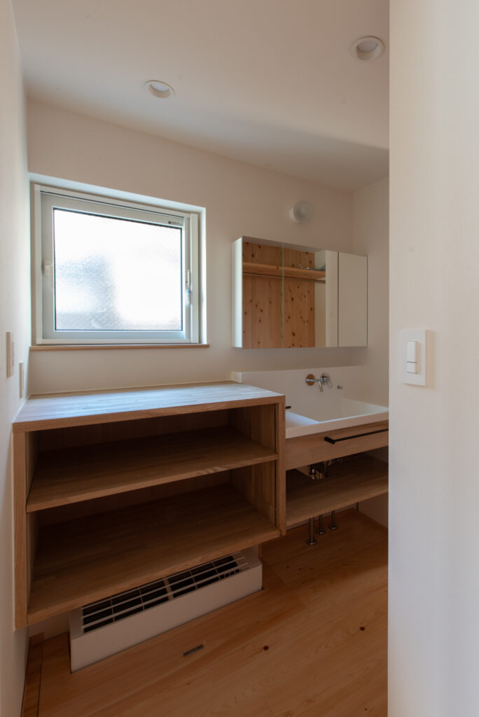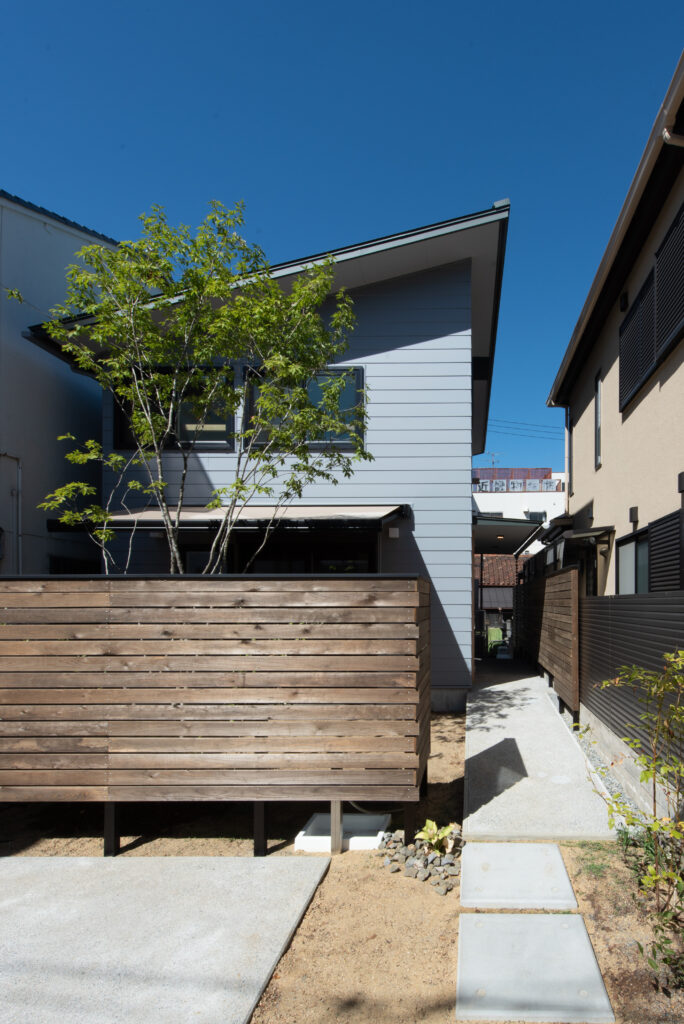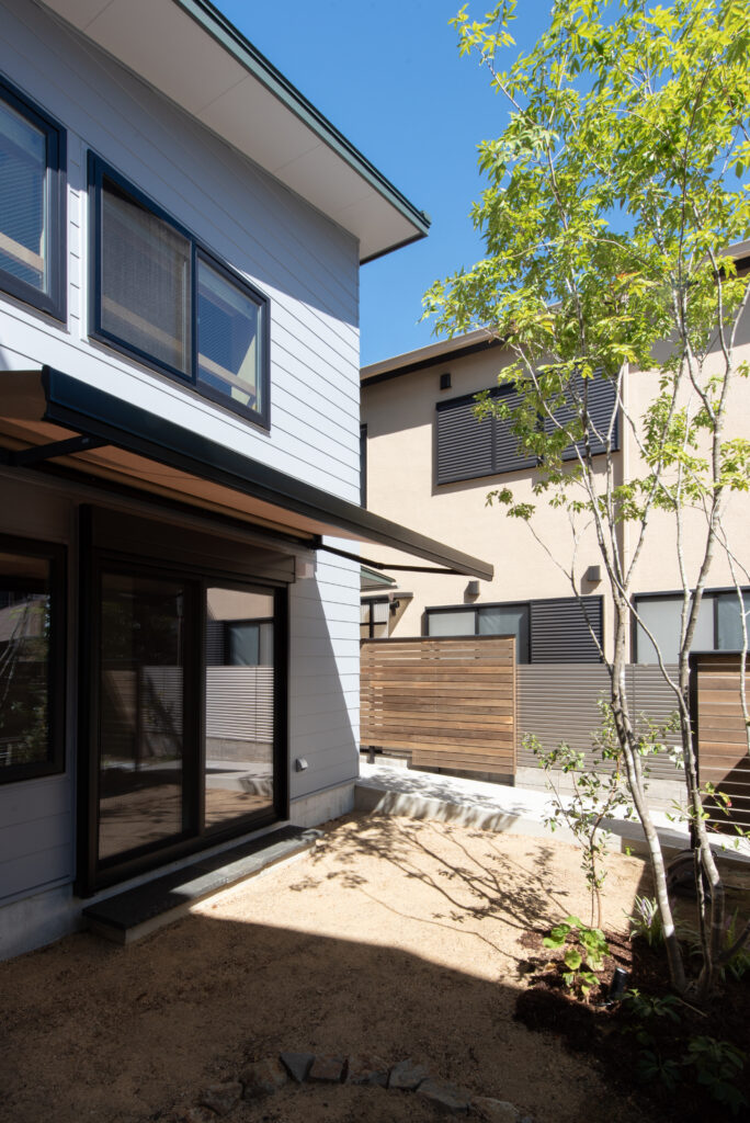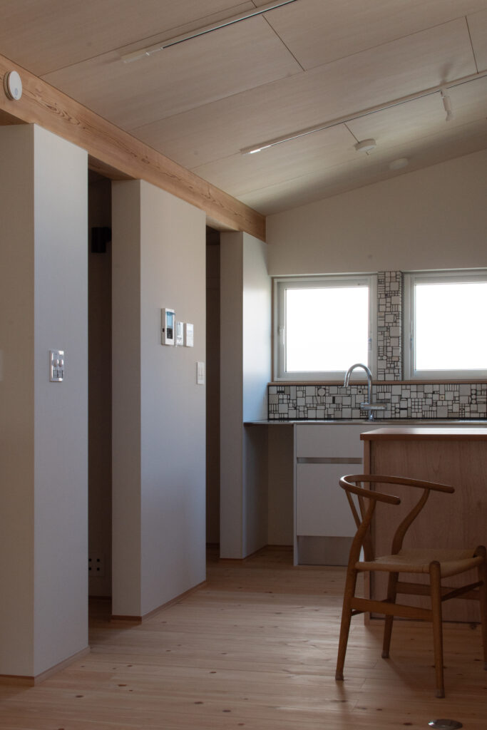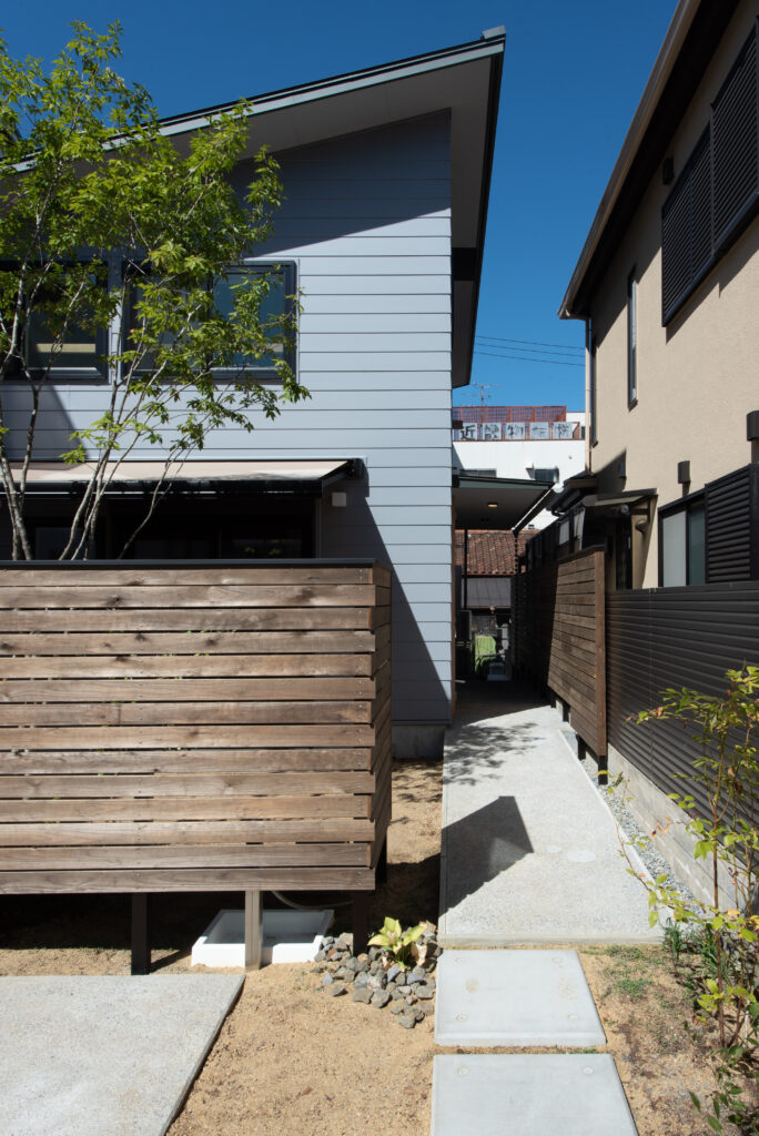 The site faces roads on both the north and south sides. There’s parking for two cars on the south side, and you can see the private garden and vegetable patch as you approach the front door.The two-story plan is structurally advantageous and simple to maintain.The first floor features a dirt floor, study, bedroom, family closet, laundry room, and bathroom. The second floor features a living room, dining room, kitchen, tatami space, and storage.The entrance dirt floor is a major feature. Leaving a little more space at the entrance, this space is surrounded by a wooden fence that blocks views from the road, creating a tranquil, private space. This dirt floor serves as a hub to the study, closet, and foyer. It’s envisioned as a place to relax, play music, or just hang out. While it’s common for homes to connect to the outdoors from the living room, the unique feature of this home is that the dirt floor, located outside the living room, connects to the outdoors and allows for a rich lifestyle while enjoying the changing seasons.The study is designed to feel semi-detached from the rest of the house. Having a function other than residence creates a sense of freshness. It connects to the entrance hall and the garden. Separated from the main living area, it’s the perfect place to work.The “family closet” continues from the entrance. This is the basic flow line for when people get home, securing their clothes and storage before passing through it to the bathroom. This flow line is also important for laundry.The “bedroom” and “children’s room” are located at the back of the first floor. The children’s room is designed to be flexible for future use.Upstairs to the second floor is a large space with a sloped ceiling. The kitchen, dining room, and living room are connected next to each other. The kitchen has a wall-type kitchen facing north. Counter storage is installed to gently separate the kitchen area. The kitchen has an adjacent pantry, approximately 2.5 tatami mats in size, which is utilized to keep the kitchen tidy. The storage space next to the pantry is filled with hobby items, providing not only storage but also a comfortable feeling of being secluded in this small space.Counter storage is installed along the wall leading from the kitchen to the dining room and living room. Our goal is to provide ample storage for everyday items, children’s homework and writing materials, and television and audio equipment, allowing for a tidy and organized living space. Storage rooms and counter space have also been maximized to keep everyday areas clutter-free.The kitchen is designed for standing, the dining area for seating, and the sofa and tatami area are designed for seating. This is a place where you can lounge around on a regular basis. In winter, sunlight pours in brilliantly through the south-facing waist-high windows, creating the ultimate relaxing space.Functional, beautiful, and fun. This is the concept.It’s not particularly large, but it has a spacious feel, allowing the family to live freely.