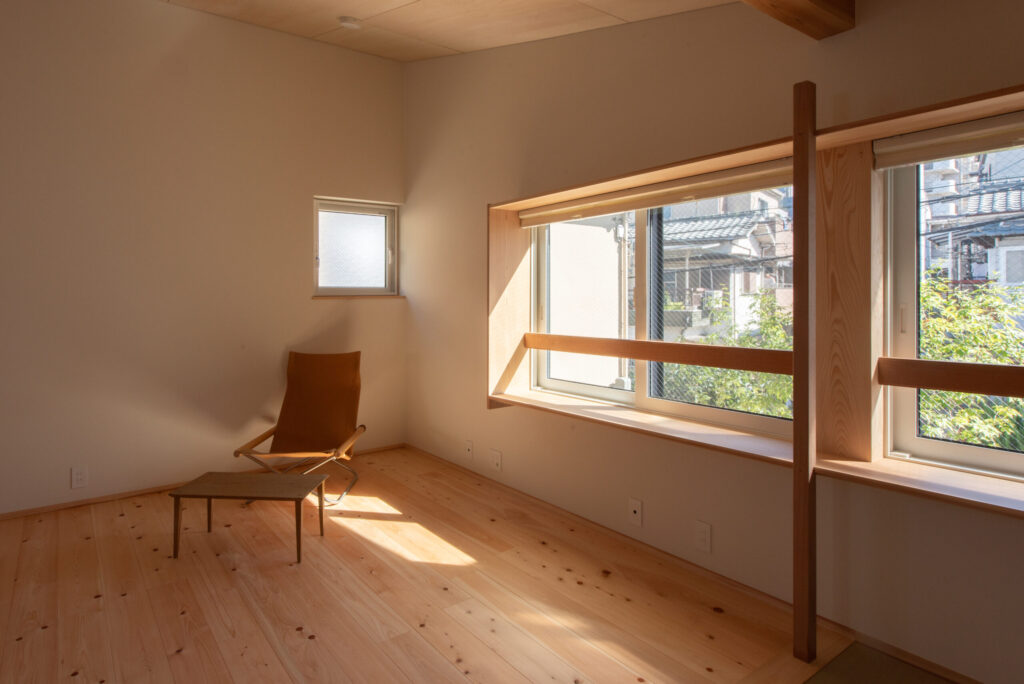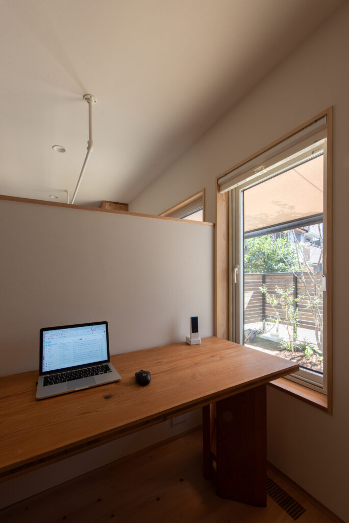 『書斎』は、家から半独立している雰囲気に作り込みます。住居以外の役割を持たせることで、新鮮さを醸し出す。玄関土間とのつながり、庭とのつながり。生活のメインのリビングと離れており、仕事には最適な場所です。