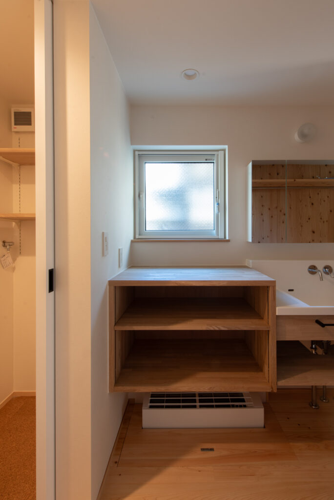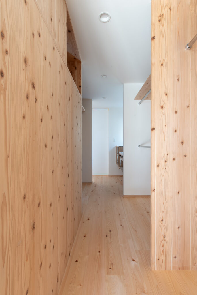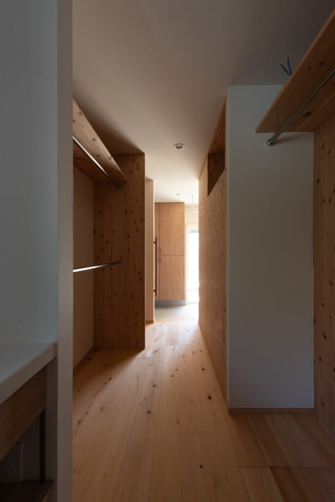 玄関から続く『ファミリークローゼット』。ここが帰宅後の動線の基本ラインとなり、衣類や収納を確保し、そこを通って洗面所へ。この動線は洗濯動線としても重要なラインになります。