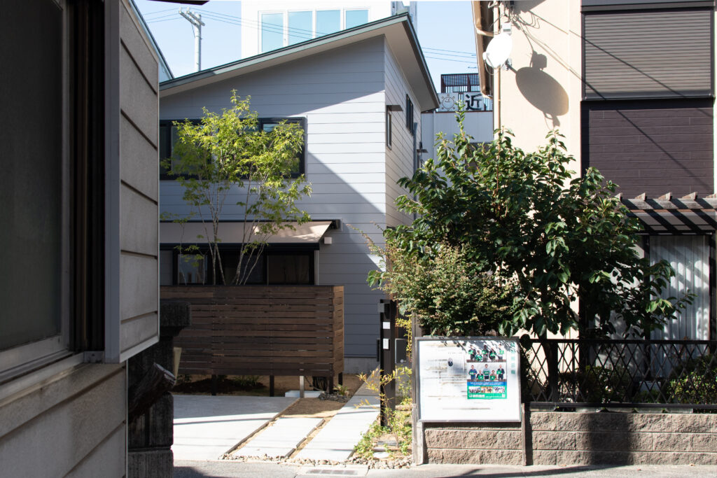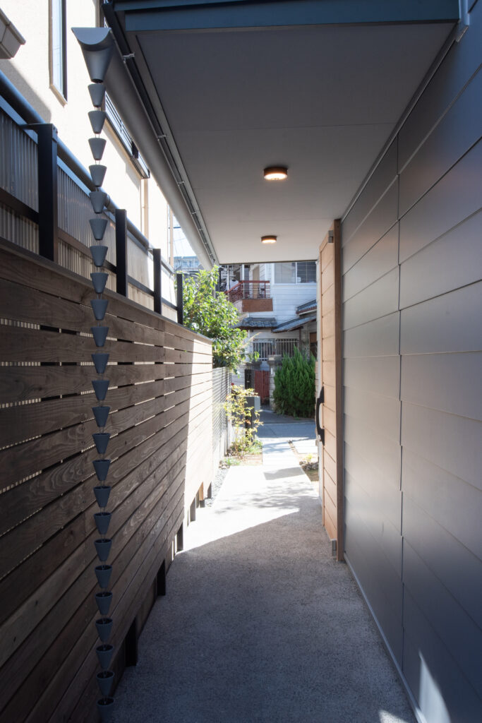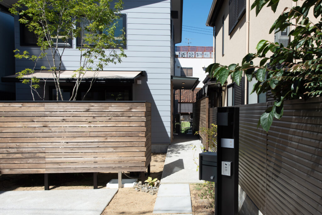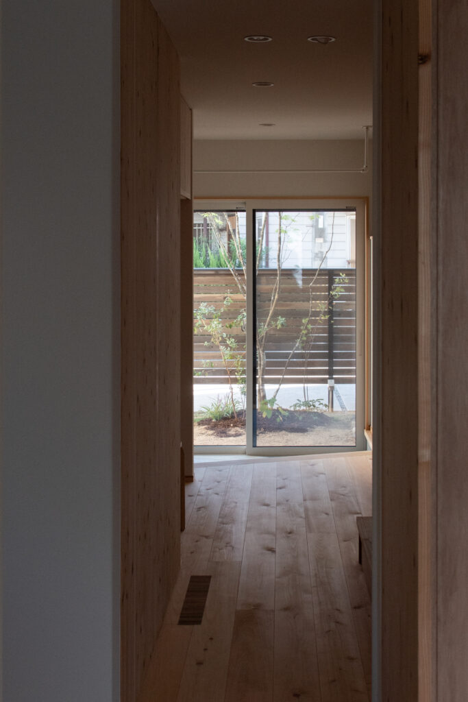 大きな特徴である『玄関土間』。玄関に少し余裕を持たせたこの空間は、道路からの視線を遮る板塀を設置し、落ち着いたプライベート空間になります。この玄関土間が、書斎・クローゼット・玄関ホールへのハブとなります。音楽をやったり、くつろいだりと、居場所のひとつとなるイメージです。リビングから外につながる暮らしが一般的ですが、リビング以外の場所『玄関土間』で、外につながり、四季を感じながら豊かに暮らせることが、この家の大きな特色となります。