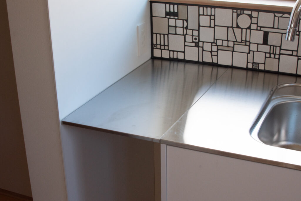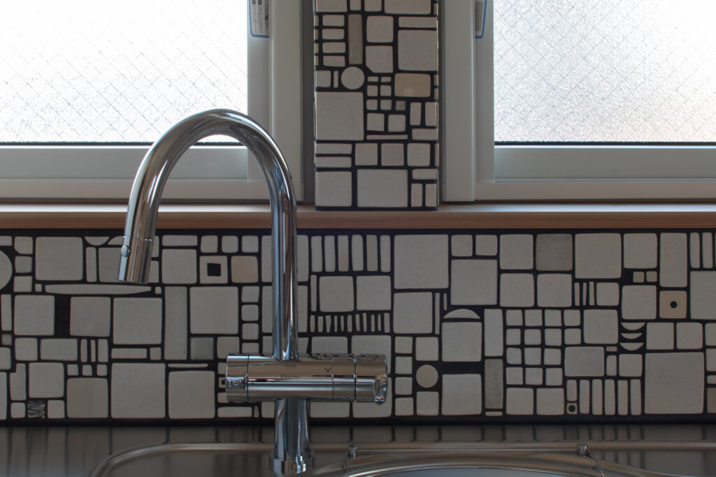 キッチンからダイニング、リビングへと続く壁面にはカウンター収納を設置。日用品などの収納として、またお子さんの宿題や書き物、テレビやオーディオ関係と、収納量を確保して、すっきり暮らせることを目指します。収納室、カウンター収納も最大限に活用し、普段の居場所はスッキリできるように配慮。