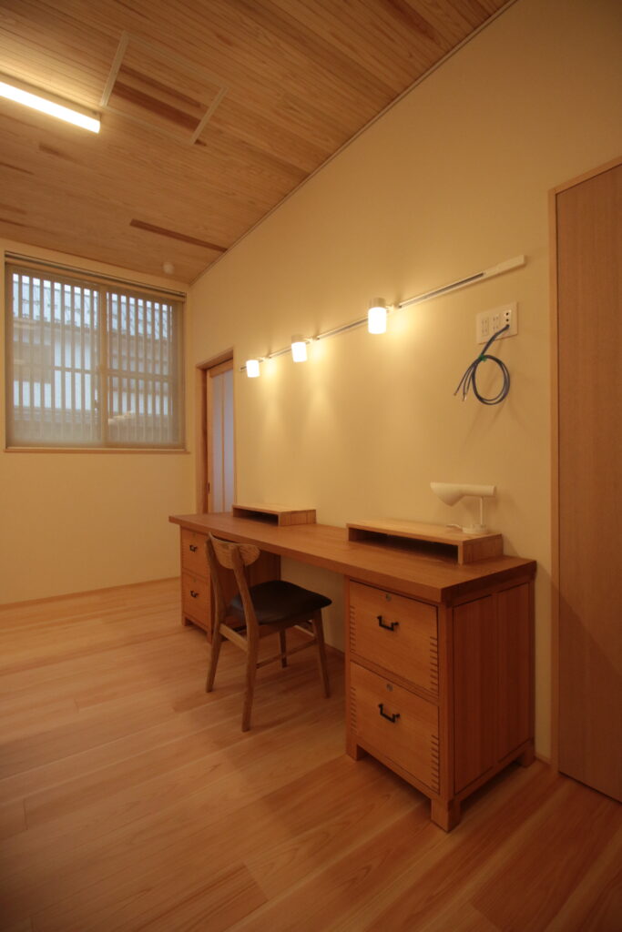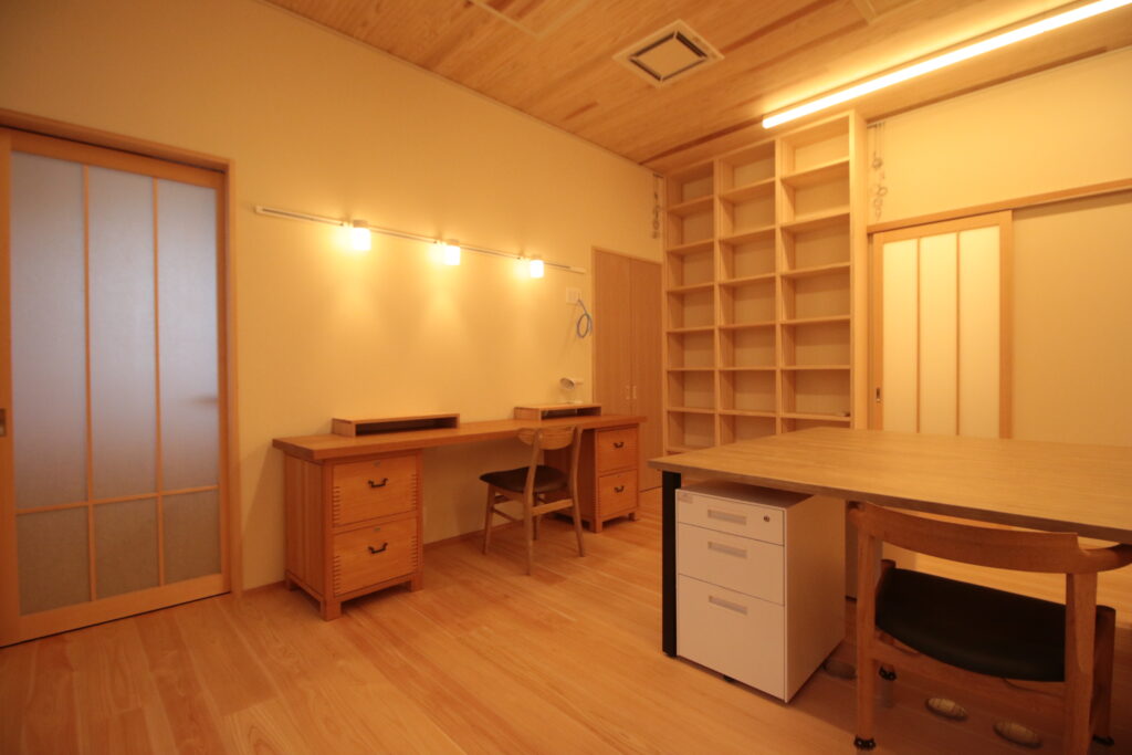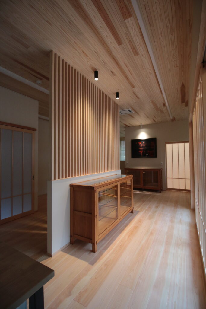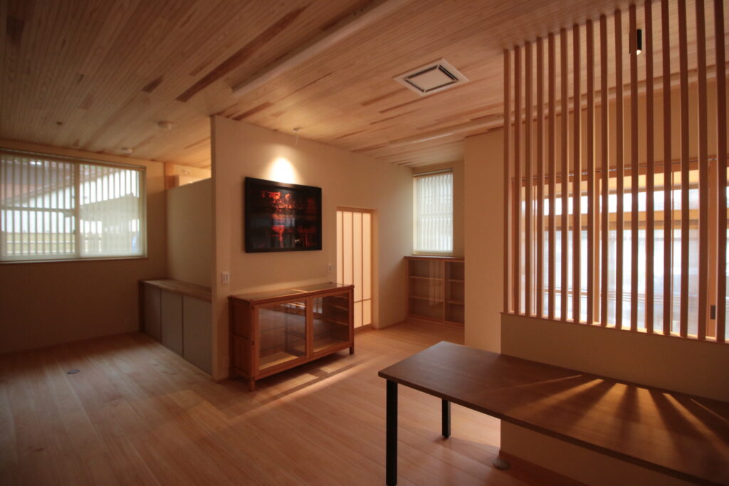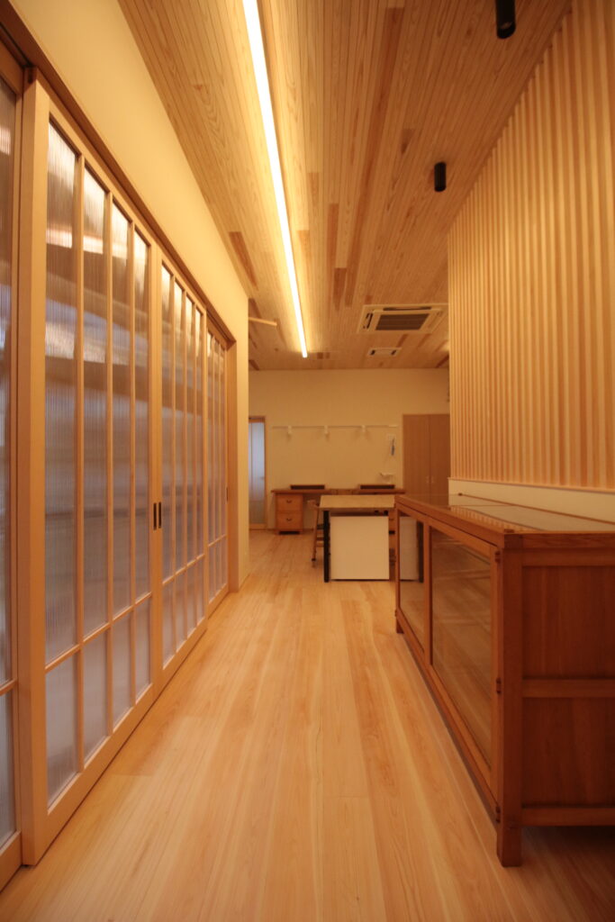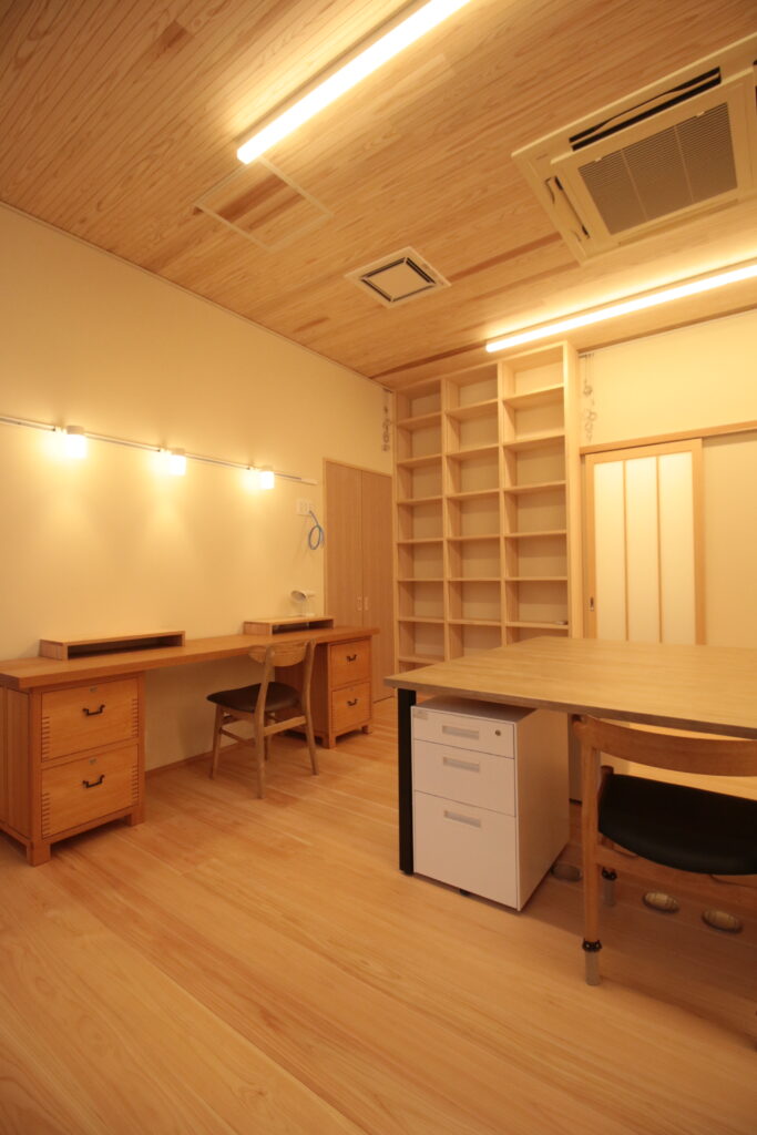 Even within the Kansai region, Mount Koya in Wakayama is cool in the summer but cold in the winter.This office has endured the cold for many years. When we visited for a meeting, the landscape was covered in snow, and even inside the office, when the ceiling-mounted air conditioner was turned on, the upper part of the room was warm, but the feet were cold. It was cold from the ground up.By insulating and airtightening the floor, walls, and ceiling, we made the work space comfortable and energy-efficient.The company also supplies talismans to the temple, and requested a warm wooden space.The cypress flooring and cedar paneling on the ceiling are sourced in Ryujin, Wakayama, which we regularly use. Since Mount Koya is located in Ryujin, this is truly a case of local production and local consumption. Using wood from the nearby mountains, we are beginning to create a work environment that is friendly to people, both in terms of its feel and atmosphere.