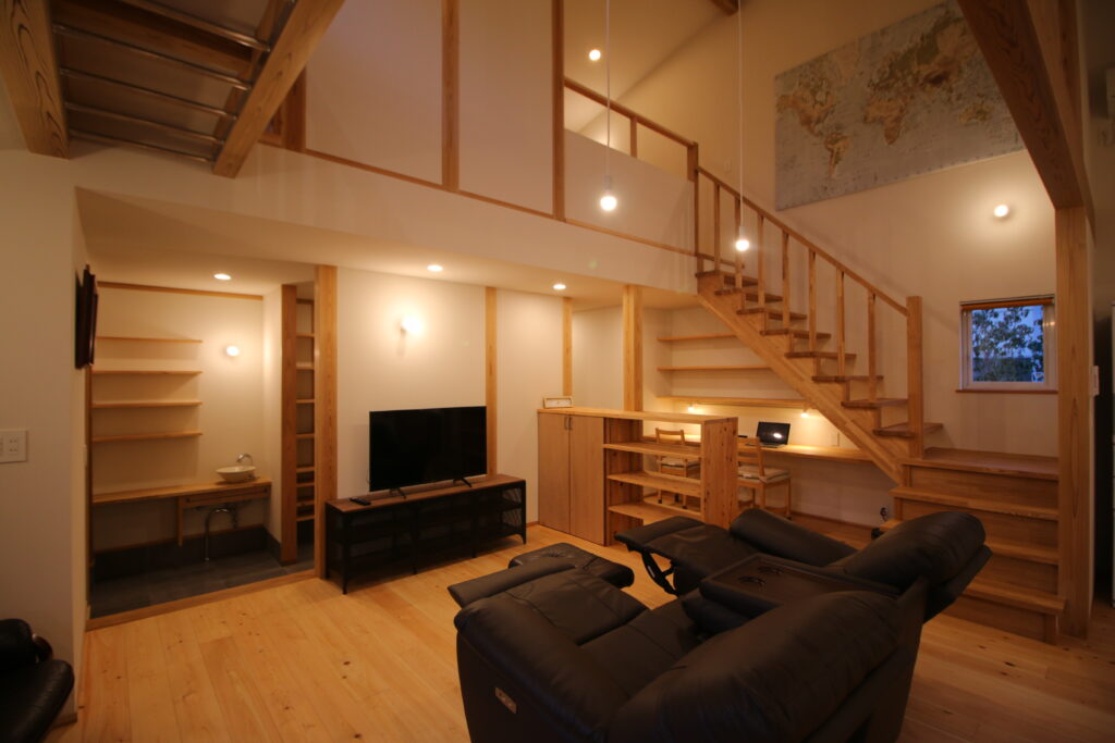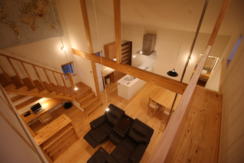 吹き抜けから太陽が燦燦と降り注ぐリビング。