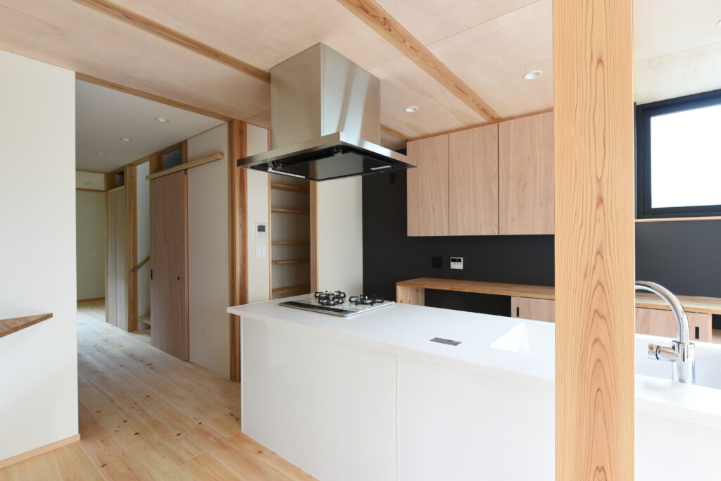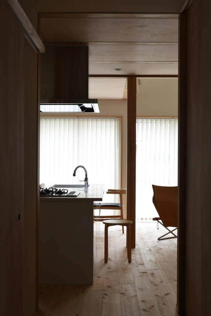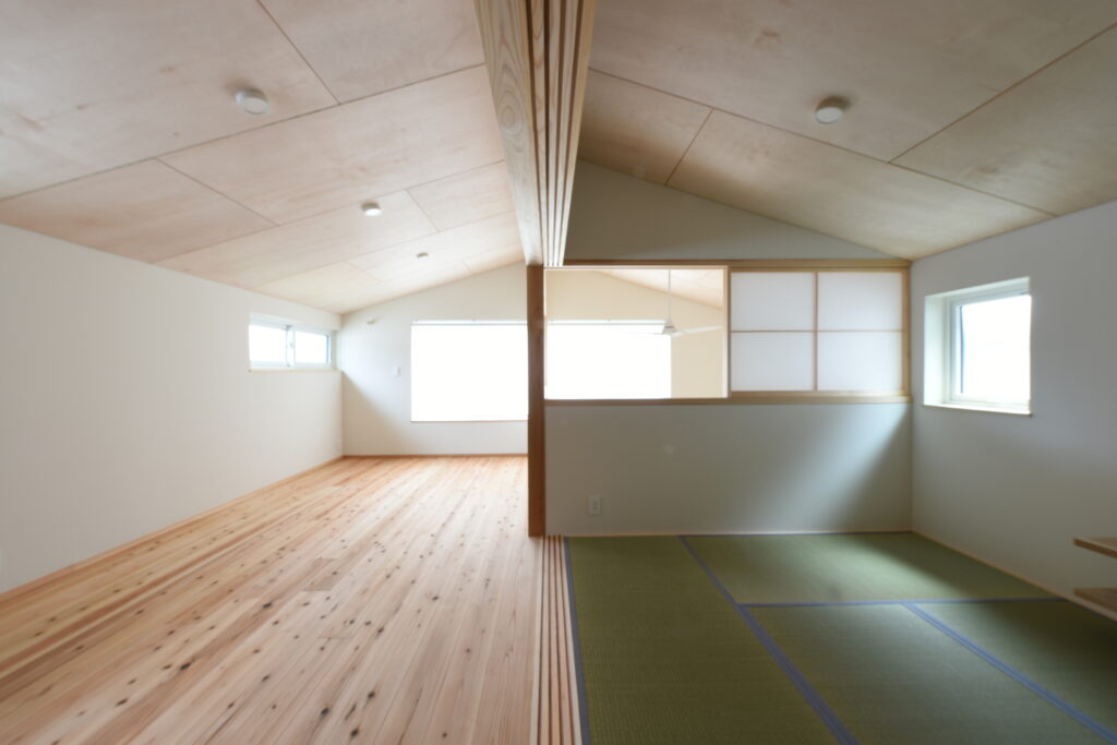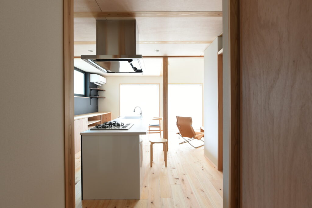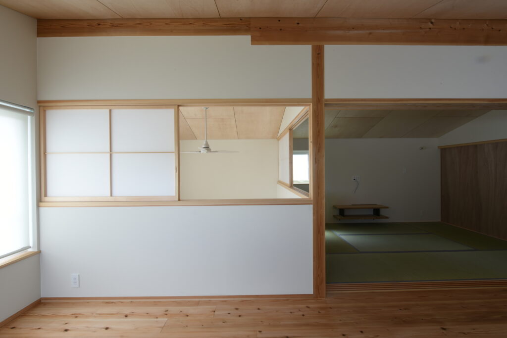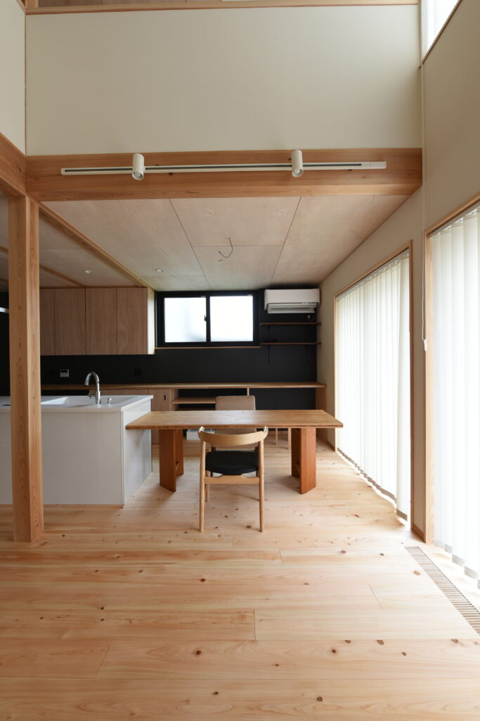 Mikita district at the foot of Mitami Shrine in Hino, Minami Ward, Sakai City. The familiar environment that I have lived in. Our clients are two families: a mother and a daughter. On the first floor, there is a main living room, dining room, kitchen, water area, and mother’s room. On the second floor, there is the daughter’s room, toilet, plumbing, and second living room. The upper and lower floors are loosely connected by an atrium, and each floor has its own lifestyle. The mother could no longer bear the cold in winter and had previously been able to rent an apartment only for the winter months. Whether it’s winter or summer, we offer energy-saving and comfortable living options. This is a future home that has general barrier-free access and thermal barrier-free access.