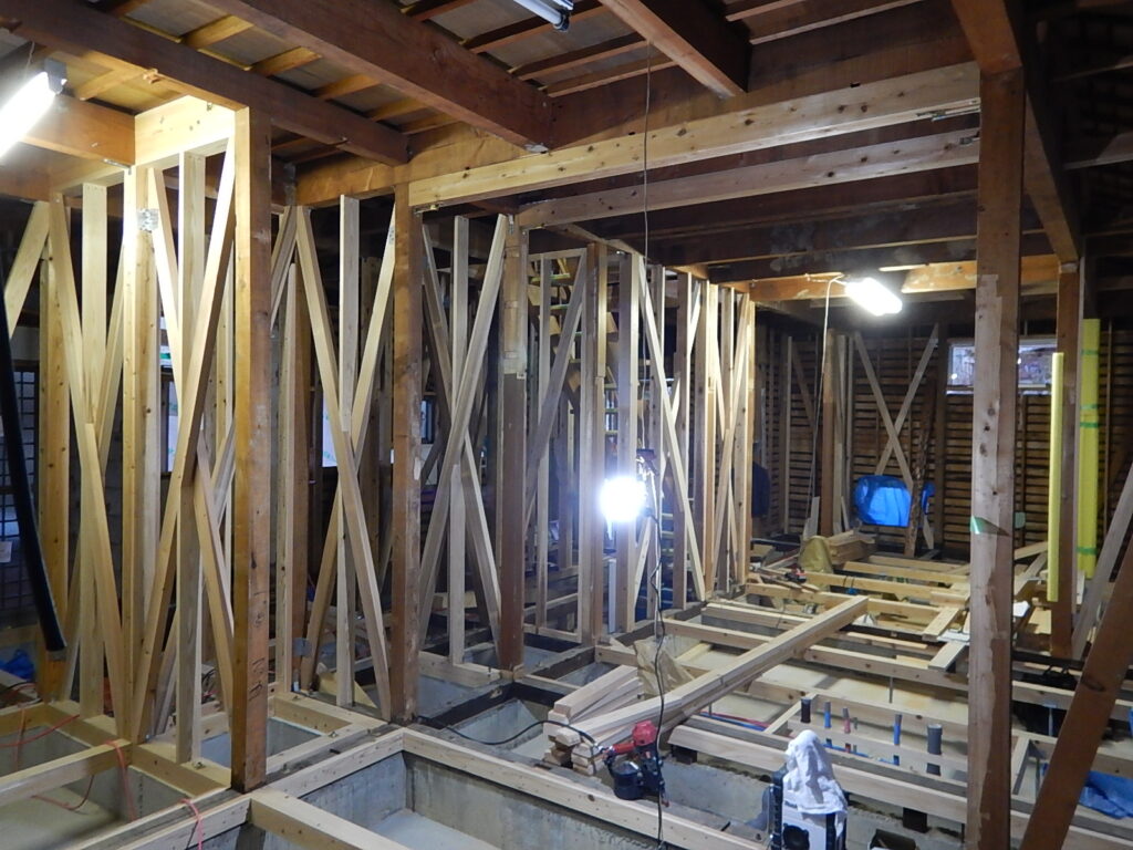 解体後、基礎工事も終わり、いよいよ大工さんの耐震補強工事へ。