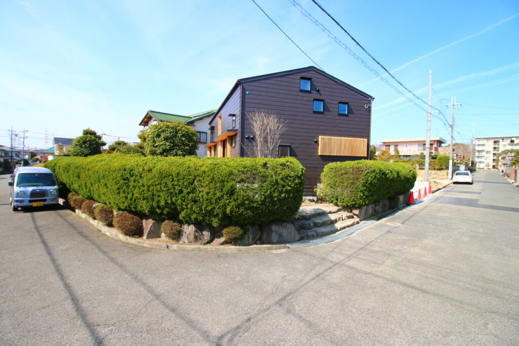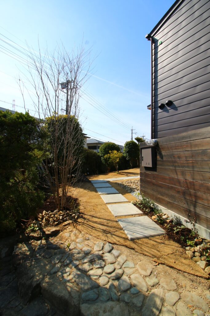 建物を斜に配した後の敷地には、緑がいっぱいの南の庭から、西側には車3台の駐車場と、