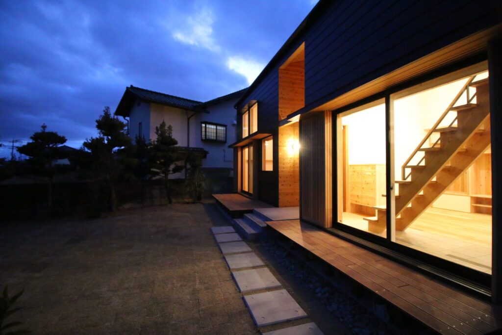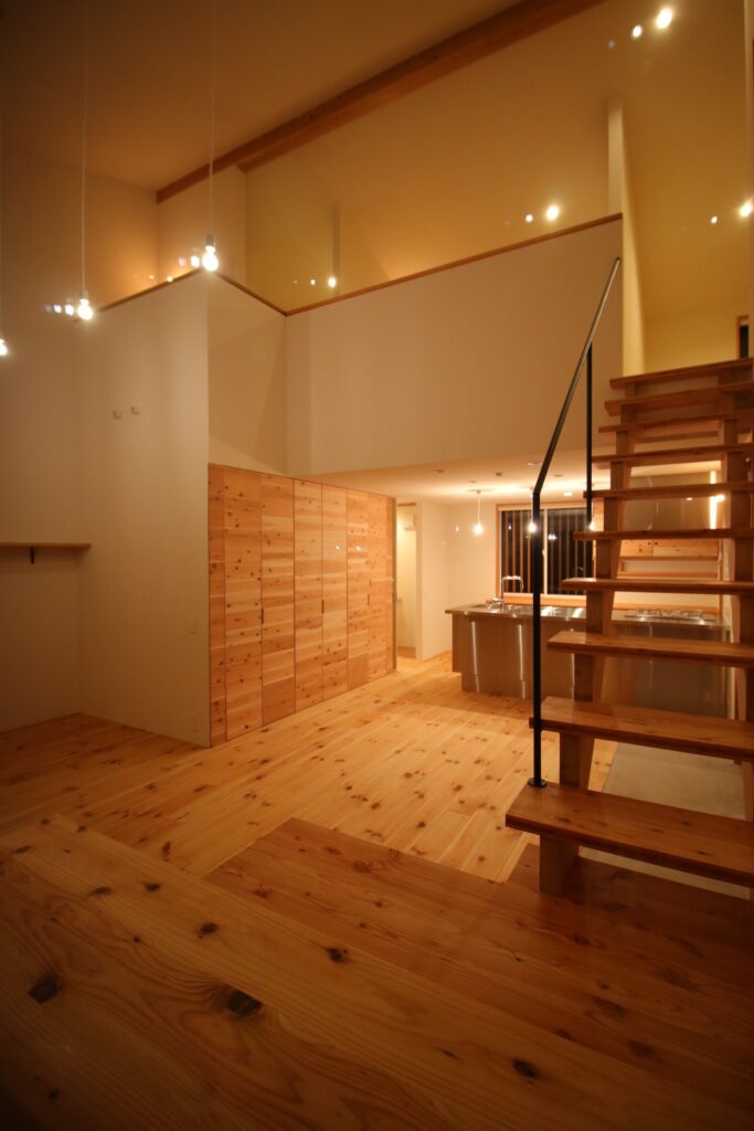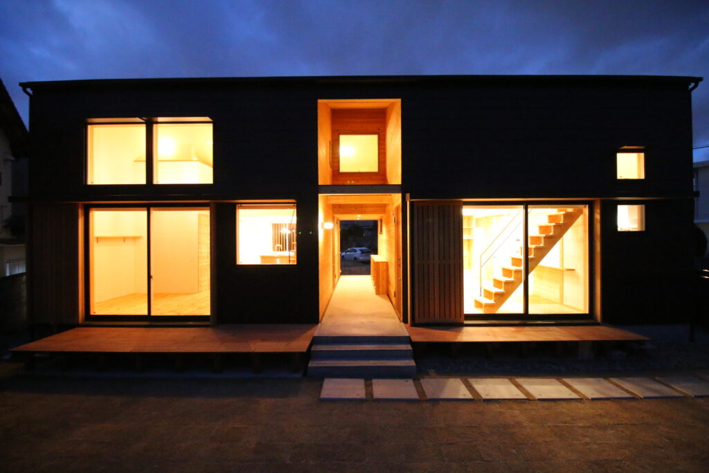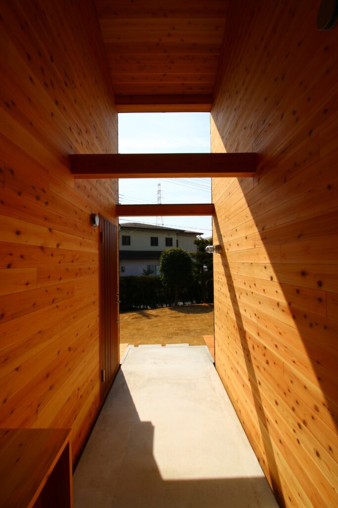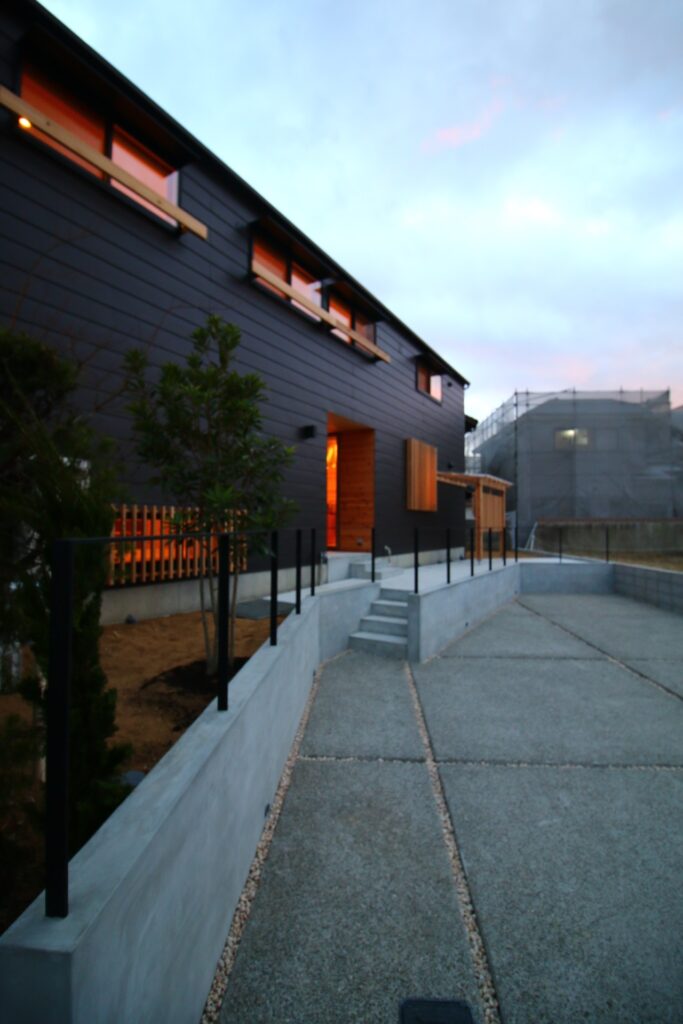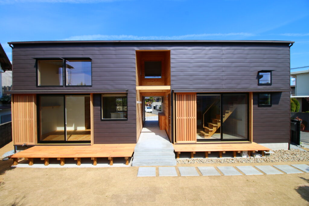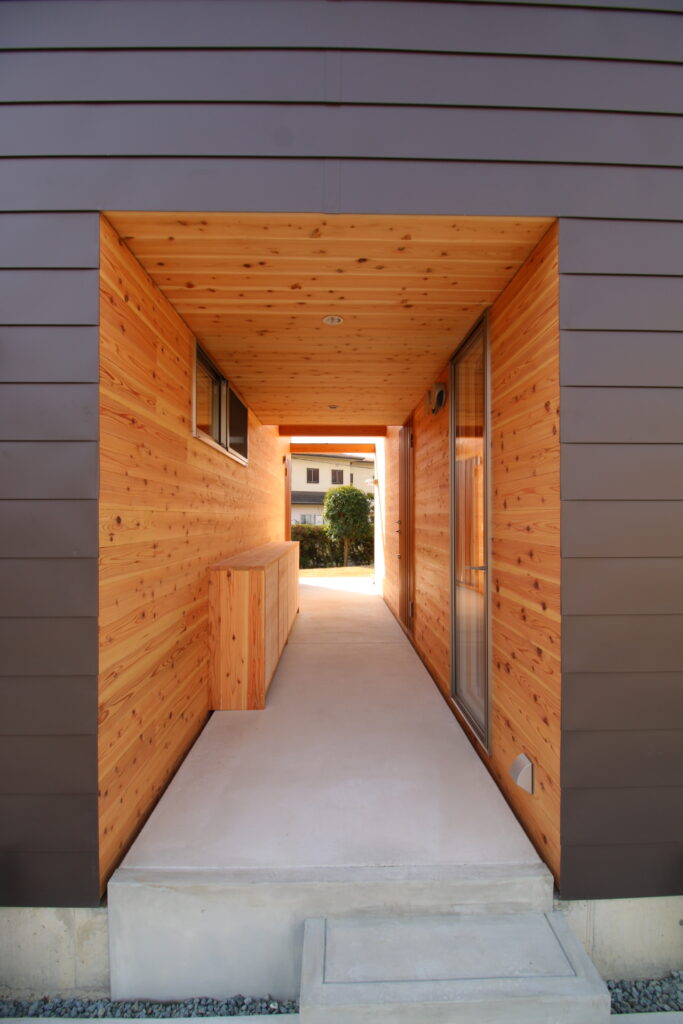 When you think of a two-family house, people take care of each other and are taken care of by each other. In the past, it may have been a form that was avoided. I tried to think about such a two-family house with just the right distance. For example, there is an alley, and two households face each other through that alley. The alley connects with the outside world and becomes a space for hobbies and a comfortable semi-outside space. The houses are placed diagonally to the site to face the south, and each house receives sunlight in the winter through large atriums on the south side. In the summer, it blocks that sunlight and also blocks the sunlight from the west side. As a vessel for living comfortably throughout the year. The site after the building is arranged diagonally has a parking lot for 3 cars on the west side, from the south garden full of greenery. Make full use of the site. An ultra-energy-saving, highly insulated, highly airtight house that uses half the heating energy of next-generation energy-saving standards. This is a subsidy application property for a regional housing greening project/housing that accommodates three generations living together. Life develops while connecting with family, parents, children’s households, and the outside world. We have created such a “future” two-family home.